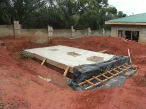 Das fuer die Kanalisiation unbedingt notwendige Manhole ist inzwischen zu 90 Prozent fertiggestellt. Eine dicke Betondecke mit drei versiegelten Einstiegen verhindert die Hereinfallgefahr fuer Kinder und Mitarbeiter. Mir erscheint es ein wenig merkwuerdig, dass die Versiegelungen jedes Mal aufgebrochen werden muessen, wenn das Manhole entleert wird. Statt dessen haette man vielleicht auch eine nachhaltigere Abdeckung waehlen koennen…aber das ist Ghana.