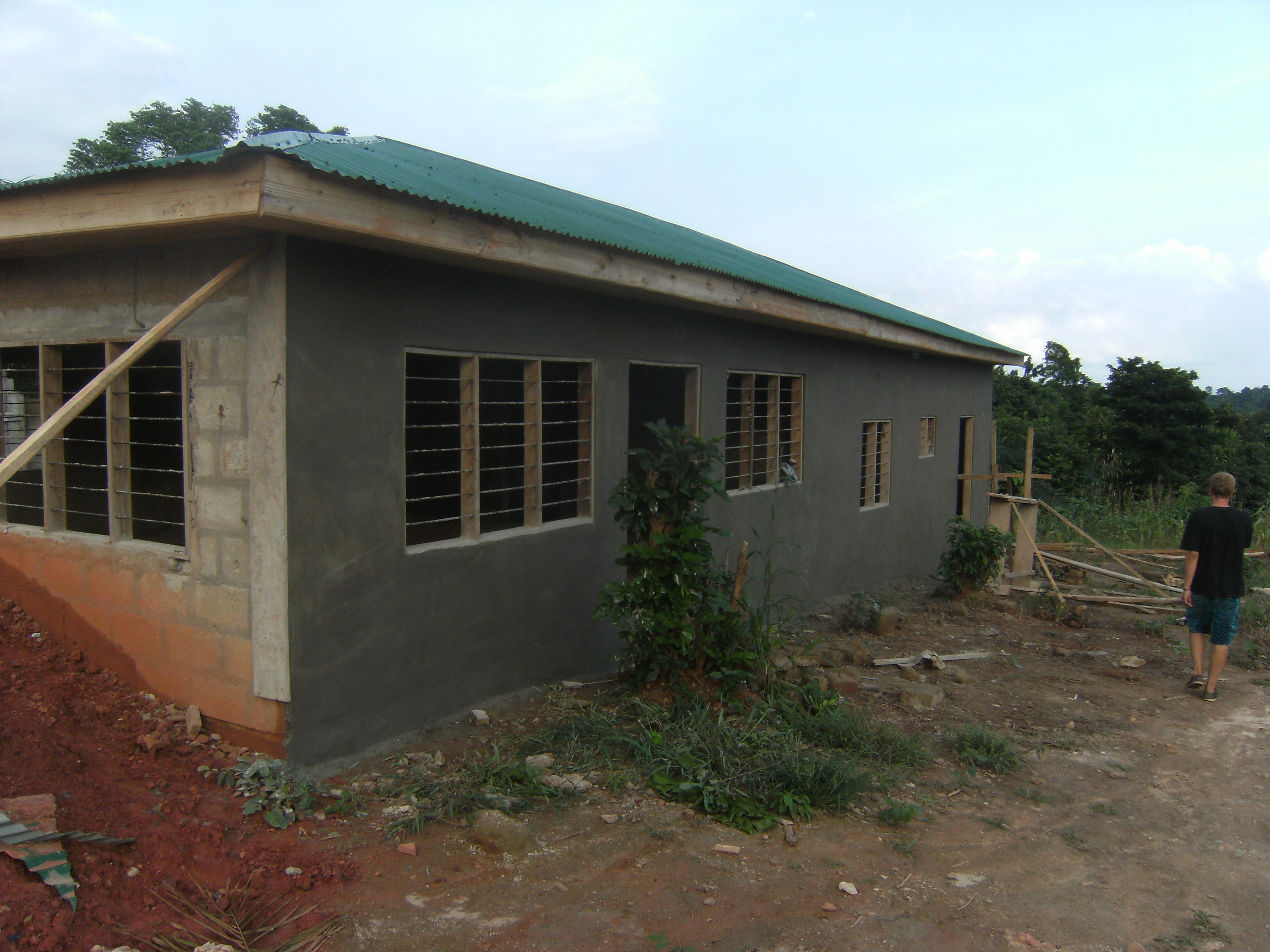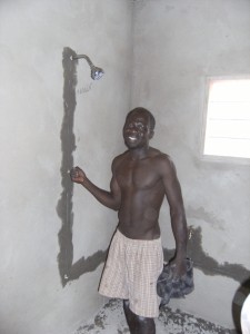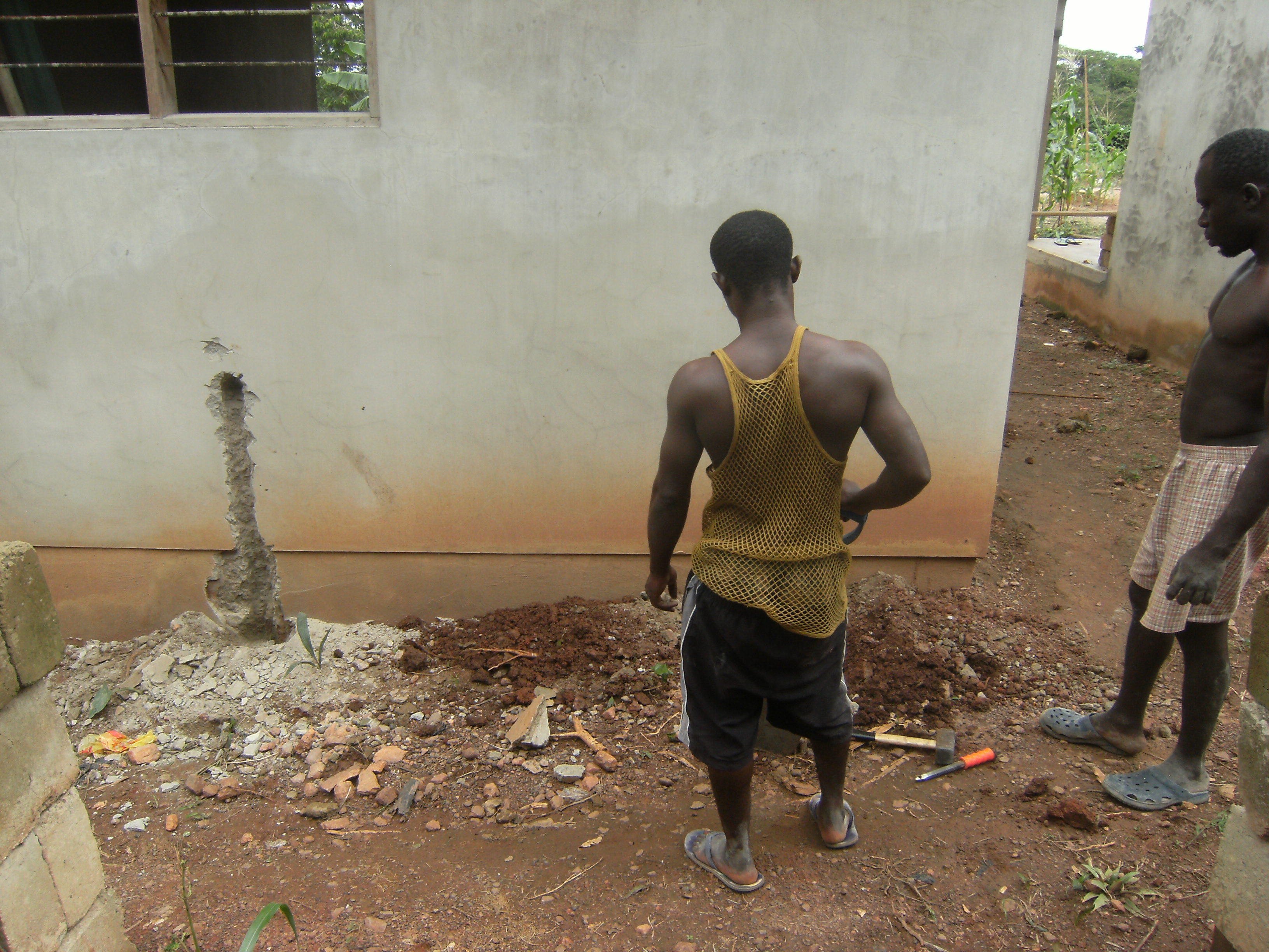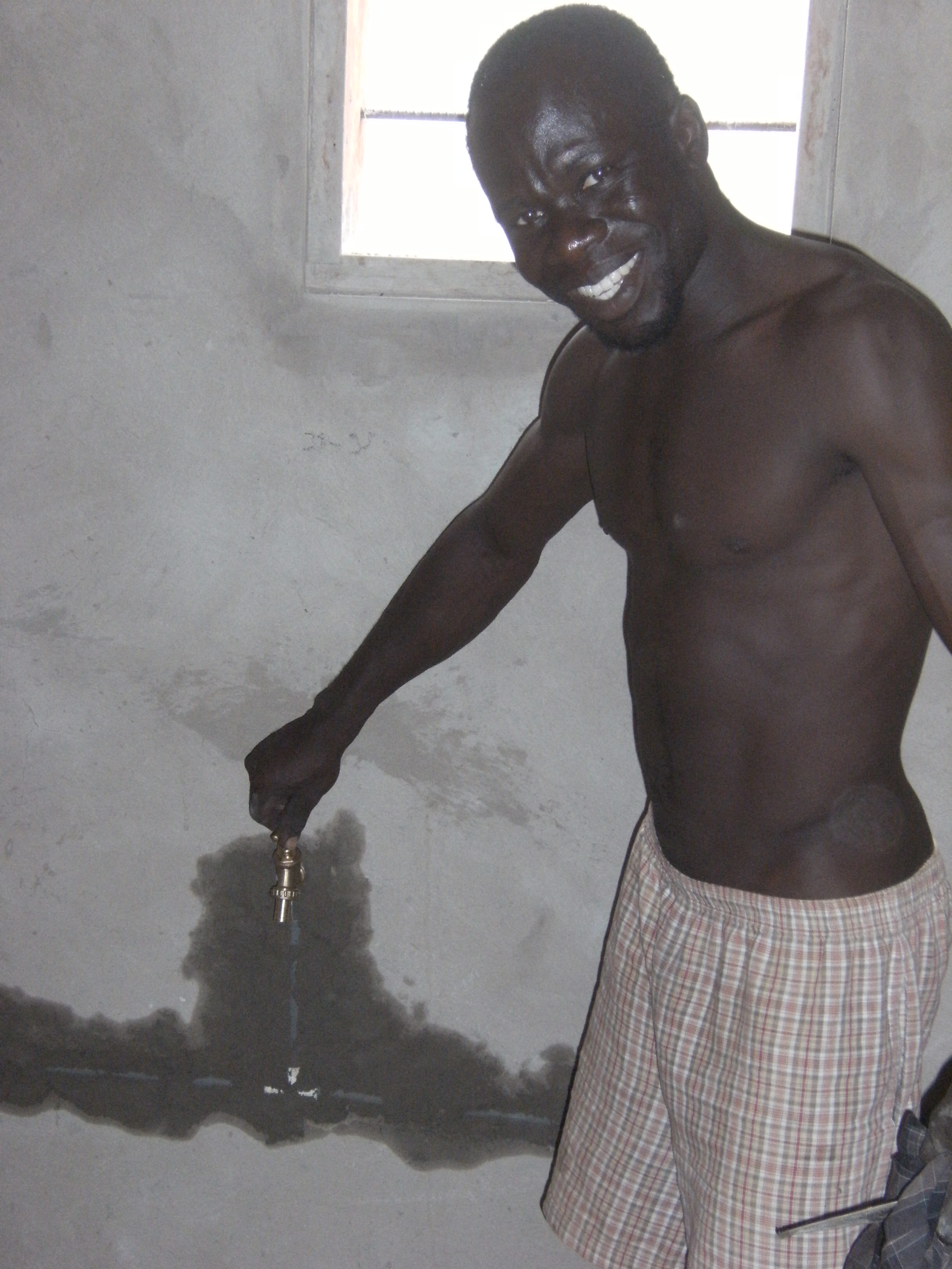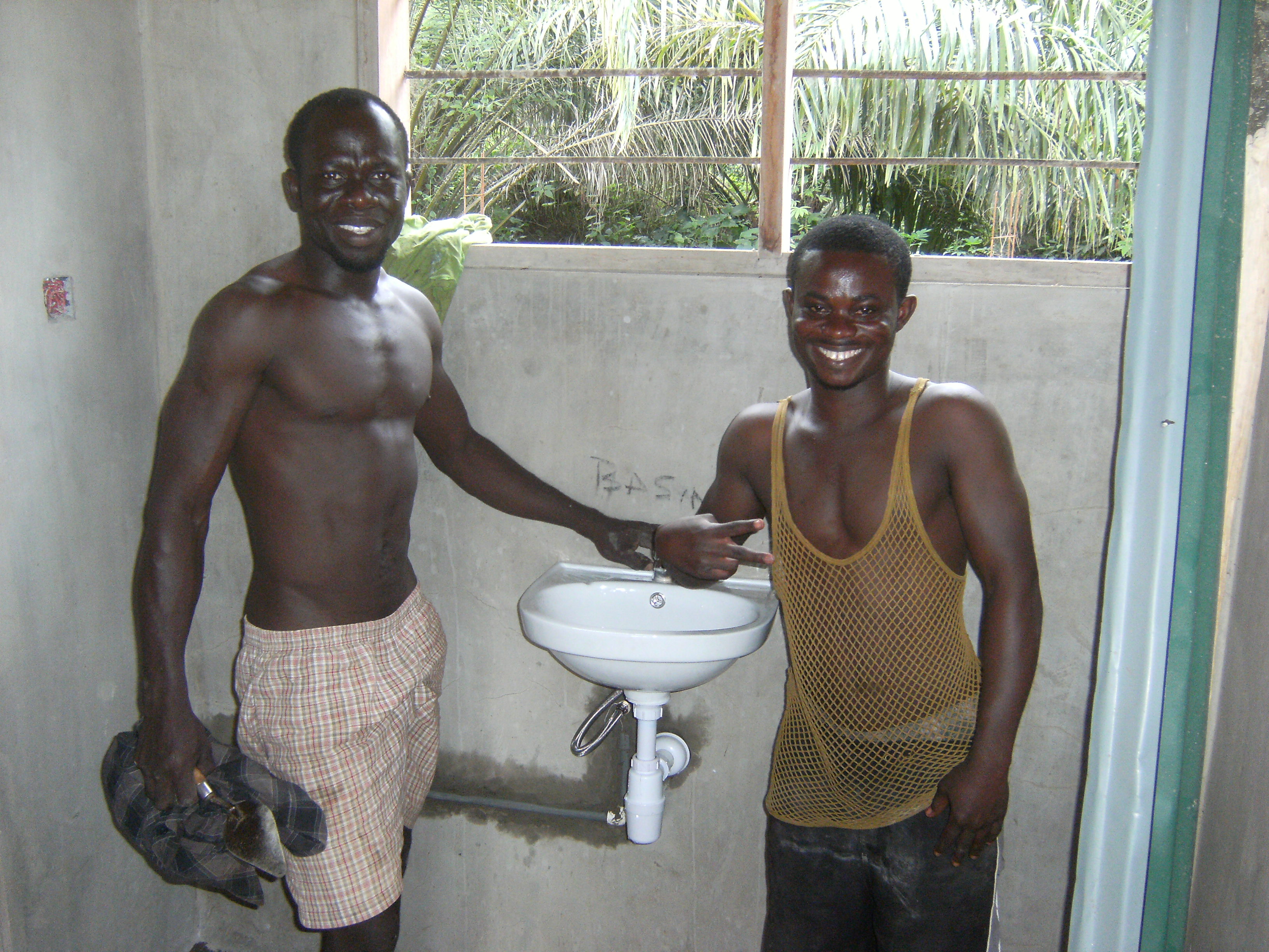 Im Haus Nr. 5 tun sich momentan ganz wunderbare Dinge. Wir haben es als unser Showhouse erwaehlt, also eine Art Modellhaus. Das bedeutet, das Haus Nr. 5 das erste komplett fertig gestellte Haus sein wird. Inklusive gefliestem Boden, installierter Toilette, Waschbecken und Dusche sowie komplett mobiliert und gestrichen. Alleine gestern haben die Klempner die Leitungen fuer die Sanitaeranlagen verlegt sowie das Waschbecken und die Dusche eingebaut. Ja, auch das ist in Ghana ganz anders. Soweit ich mich erinnere, werden beim Hausbau in Deutschland die Leitungen vor dem Verpuzten der Waende verlegt. Hier in Ghana ist das andersherum. Da werden die Waende verputzt und dann fuer die Leitungen an den entsprechenden Stellen wieder aufgestemmt. Warum? Es ist alles eine Frage des Geldes. So ist es durchaus moeglich, in einem Haus ohne eingebaute Toilette, Waschbecken und Dusche zu wohnen. Wenn dann das Geld fuer den Einbau eben dieser vorhanden ist, lassen sich diese drei Dinge ohne Weiteres auch nachtraeglich einbauen. Ebenso wuerde es mit Waschmaschine und Co. funktionieren.