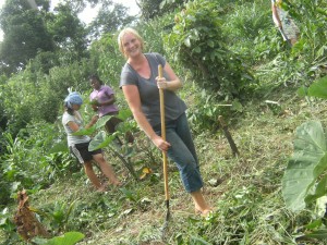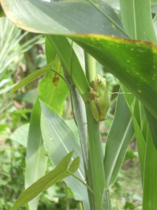 So noetig der Regen auch ist, so laestig ist der Effekt, den er auf das Unkraut hat: Das Zeug waechst und waechst und waechst. So hiess es fuer uns auch an diesem Samstag: Macheten und Harken in die Hand und moeglichst viel von dem Gruenzeug jaeten. Dieses Mal war es fuer den Cocoyam, der versucht, inmitten des Gestruepps zu wachsen. Zwischen den ganzen Graesern hin und her laufend, huepft einem dann auch schon mal der ein oder andere Minifrosch ueber den Weg. Na ja, dieser eine hing an einer Maispflanze. Noch kleiner als ein halber Daumen von mir oder eine farbenfrohe Heuschrecke auf einem benachbarten Blatt. Zwischen dem Unkraut fanden wir leider auch einige unserer Wassermelonen, die den Befall durch eine Wassermelonenkrankheit leider nicht ueberstanden haben. Na ja, eigentlich hat keine Einzige unserer Wassermelonen ueberlebt. Es scheint, als Wassermelonenanbauer haben wir noch eine Menge zu lernen. Doch unser Gaertner Othinjel kuemmert sich nicht nur darum, sondern auch um Tomaten und Chili, Cocoyam, Cassava, Mais und alles, was da sonst noch so in unserem Gemuesegarten waechst.