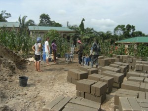 Seit ein paar Tagen werden wieder fleissig Steine fuer den Mauerbau produziert. Da kommen Erinnerungen an unsere ersten Aktivitaeten auf dem Projektgelaende hoch (siehe auch Eintrag vom…): Sand und Zement mischen, ab in die Steinmachmaschine, den Deckel mit so viel Wumms wie nur moeglich ca. fuenf mal knallen lassen und den Stein aus der Form hochdruecken. Voila, fertig ist ein weiteres Mauerteilchen. Fuer die ca. ein Klimometer lange Mauer werden einige tausend Steine benoetigt. Da haben unsere fleissigen Maurer also noch alle Haende voll zu tun. Die Mauer ist eine der obersten Prioritaeten, denn ohne eine das Gelaende komplett umrundende Mauer koennen keine Kinder in das Children’s Village einziehen.