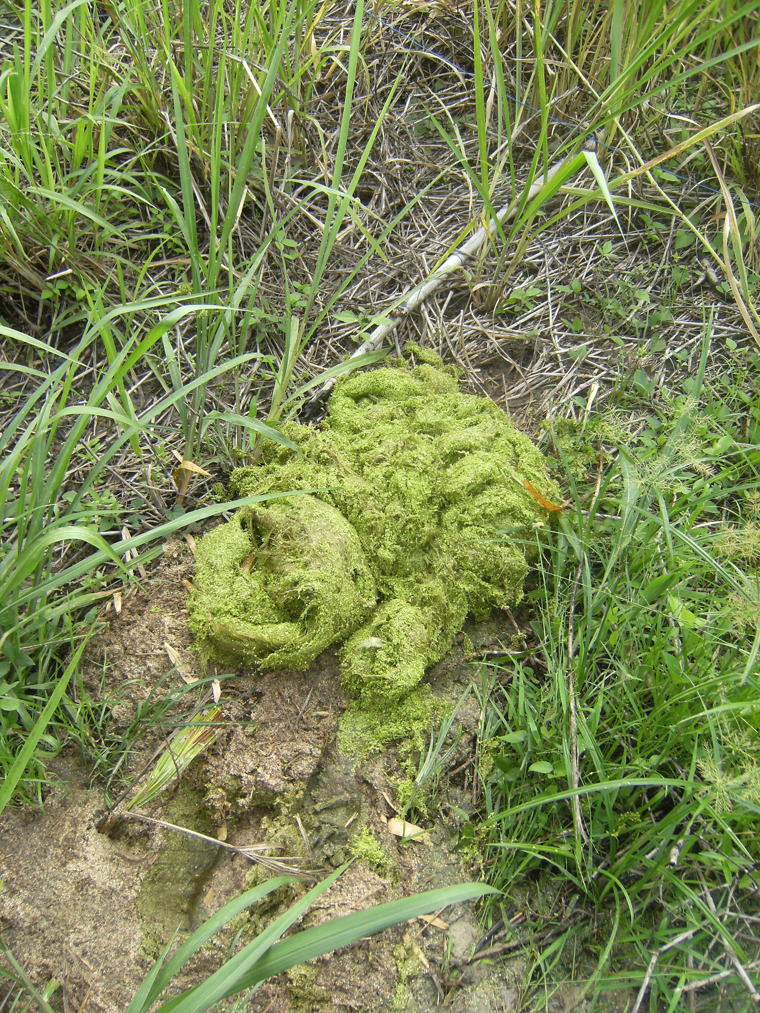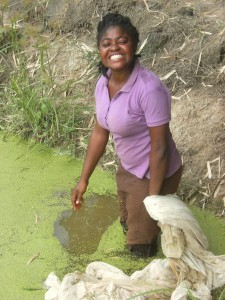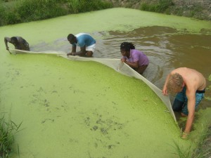 Sorgen bereitet uns momentan einer der Fischteiche, in dem die Catfish leben. Die Wasseroberflaeche ist vollkommen von einer Schicht Wasserlinsen bedeckt, die den Fischen das Atmen erschwert. Da uns bis jetzt noch keine Idee in den Kopf gekommen ist, das Problem dauerhaft zu loesen, steigen bei jedem Besuch zwei bis vier Leute in den Teich und fischen mit einem zum Wasserlinsenfischen umfunktionierten Moskitonetz die laestigen kleinen gruenen Pflanzen ab. Den Fischen scheint es zu gefallen, den dann und wann sieht man sie zur Wasserobeflaeche kommen und nach Luft schnappen. Eigentlich sehen die Wasserlinsen ganz harmlos aus. Wenn man jedoch erstmal ihre Wurzeln gesehen hat, ist es verstaendlich, dass sie den Fischen nicht Gutes tun. Insgesamt haben wir fuenf Netze voll Linsen gefischt und sind uns sicher, dass es spaetestens am kommenden Samstag wieder die gleiche Menge sein wird. Zeit, ein Gegenmittel zu recherchieren.