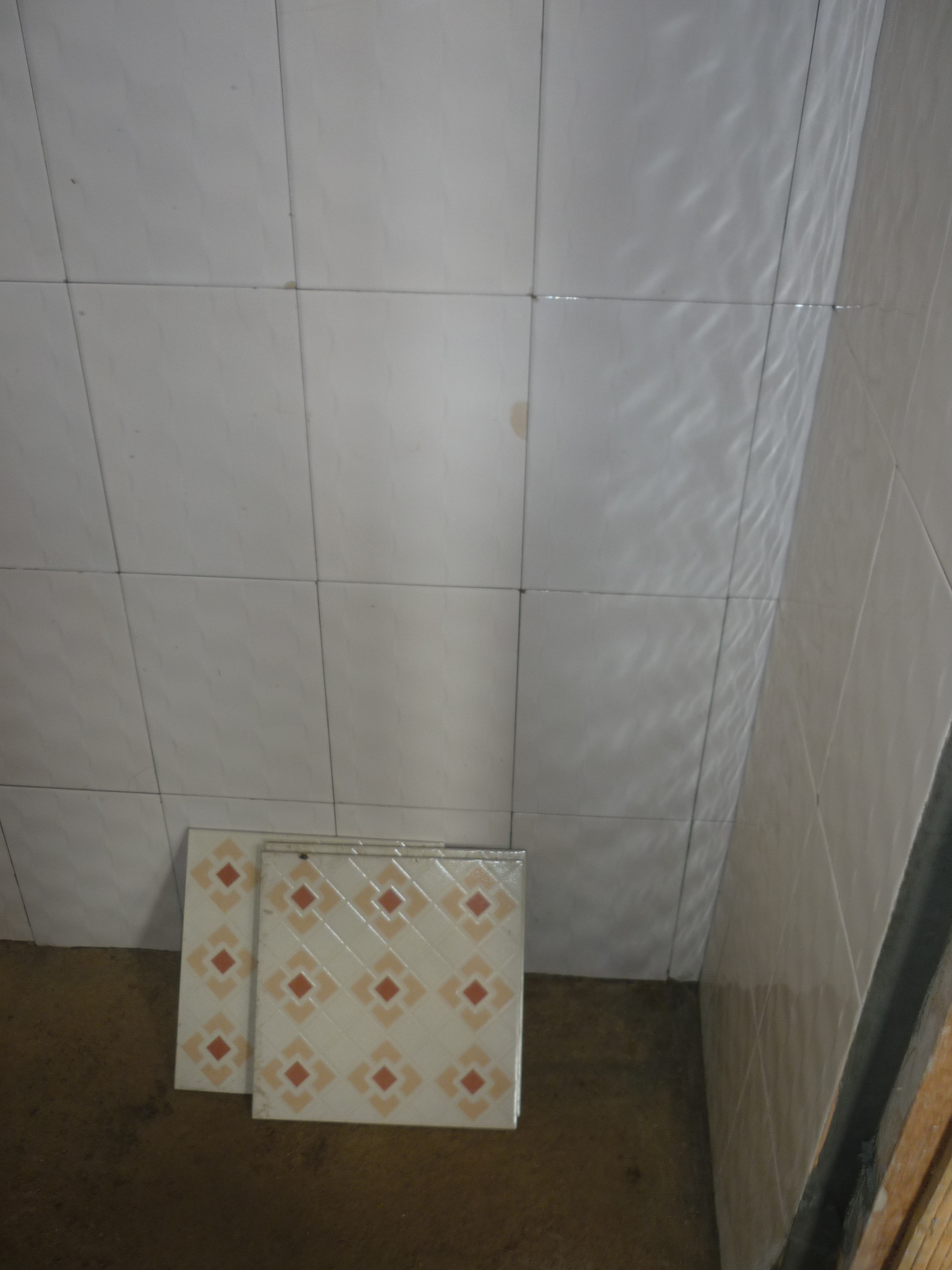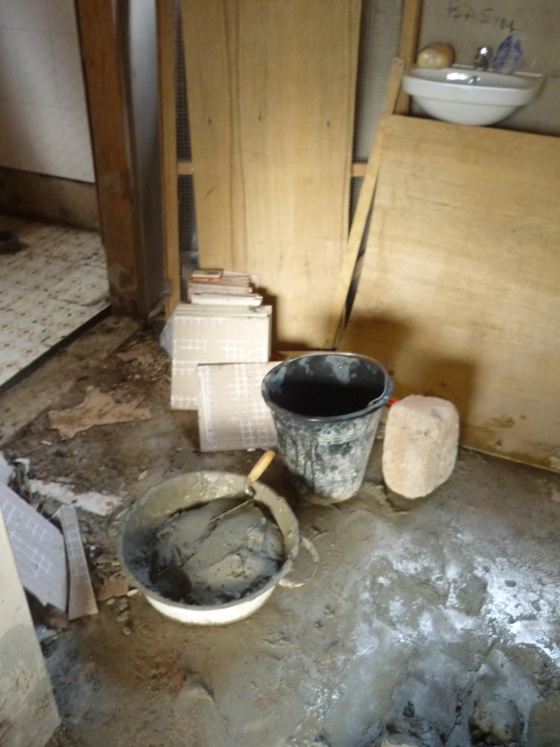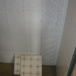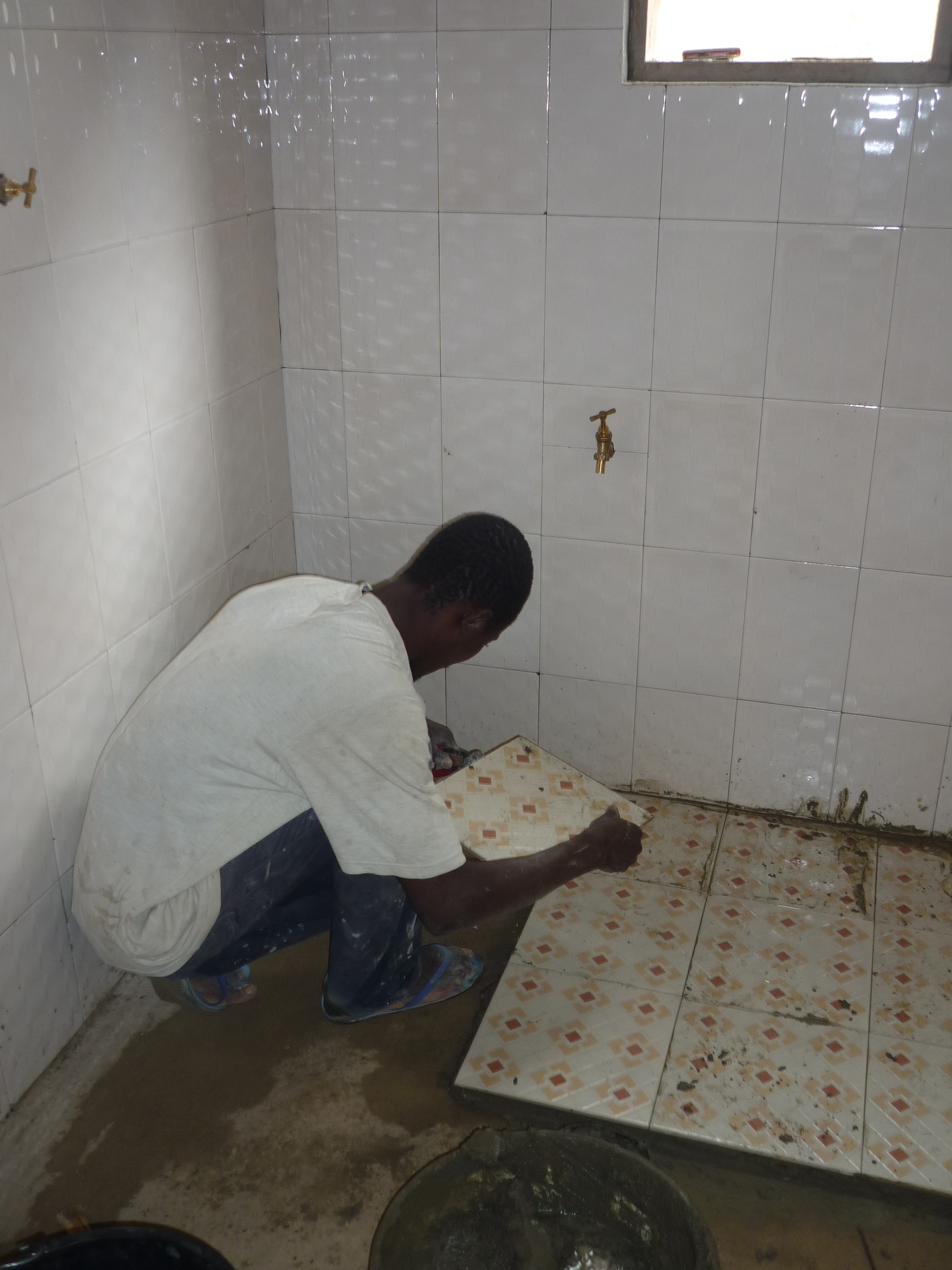 Inzwischen sind sowohl der Wohn- und Schlafraum als auch die Toilette und der Duschraum komplett gefliest, die Toilette, das Waschbecken und die Dusche sind installiert, die Decken verkleidet. Es fehlt noch die Verlegung der Fliesen auf de Veranda und im Flur sowie das Befestigen der Lamellenfenster und das Einhängen der Türen.