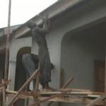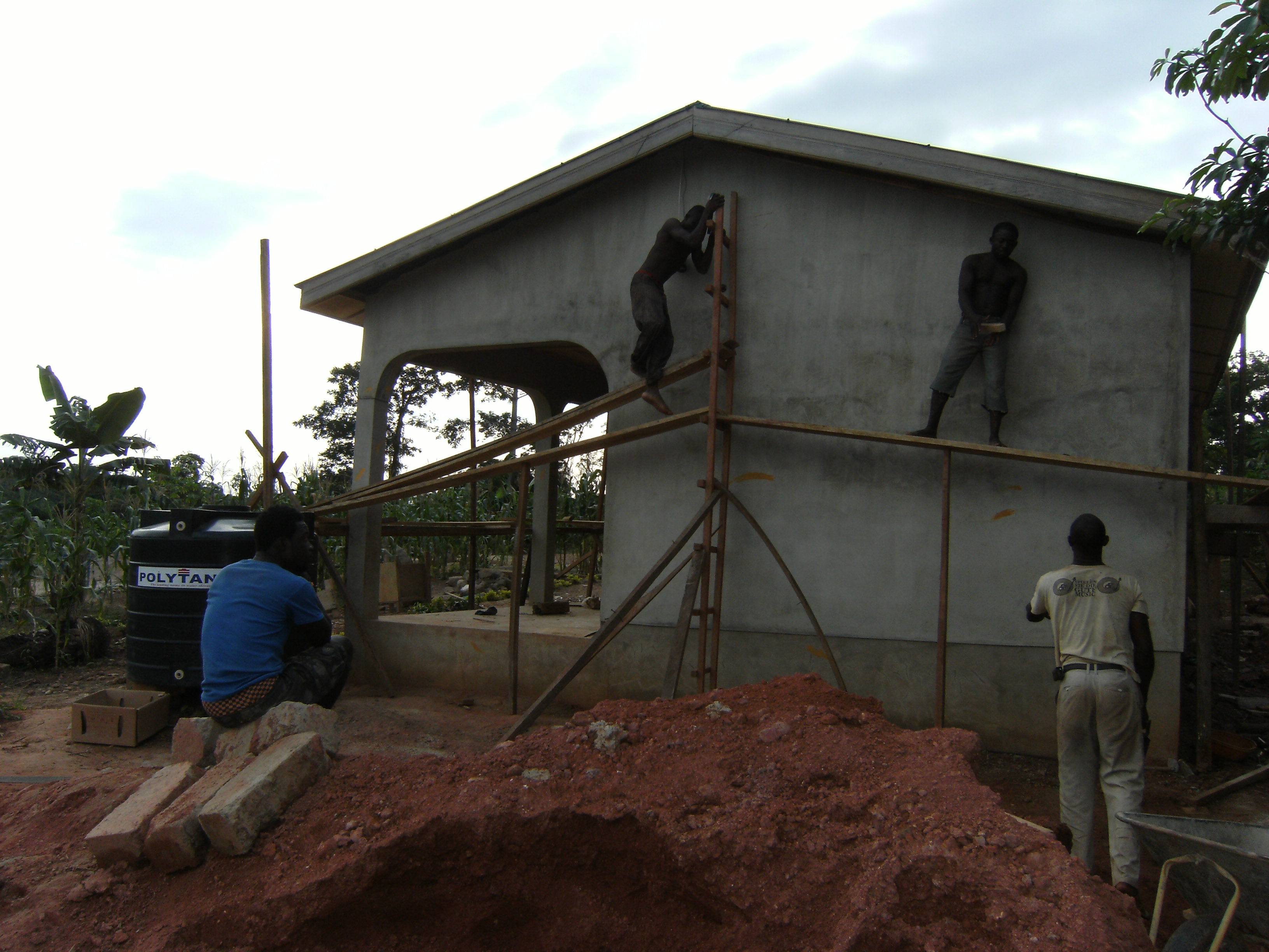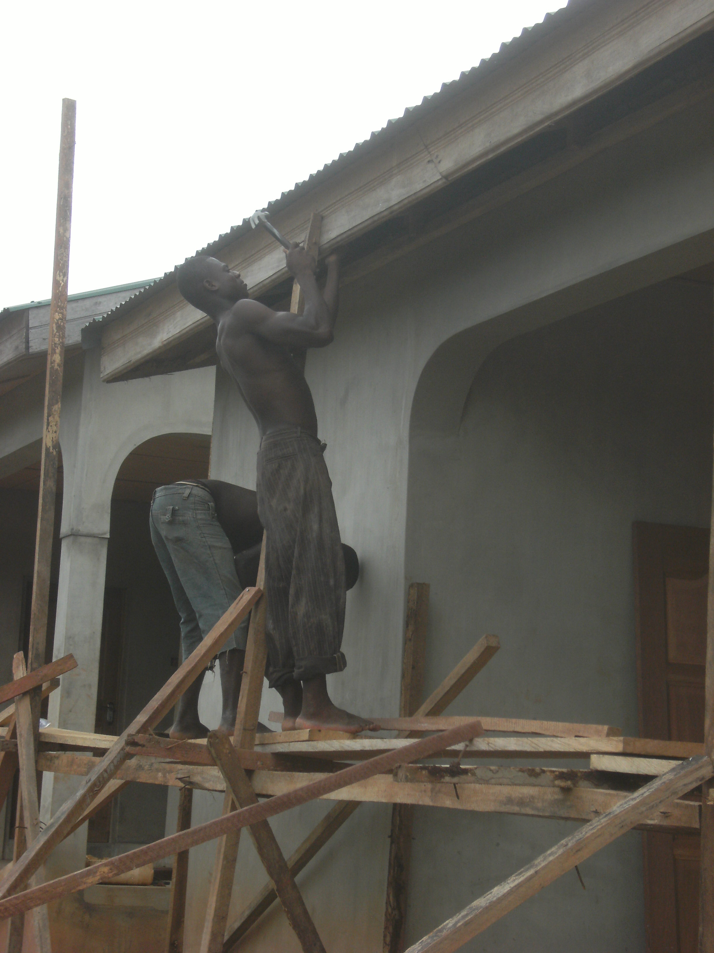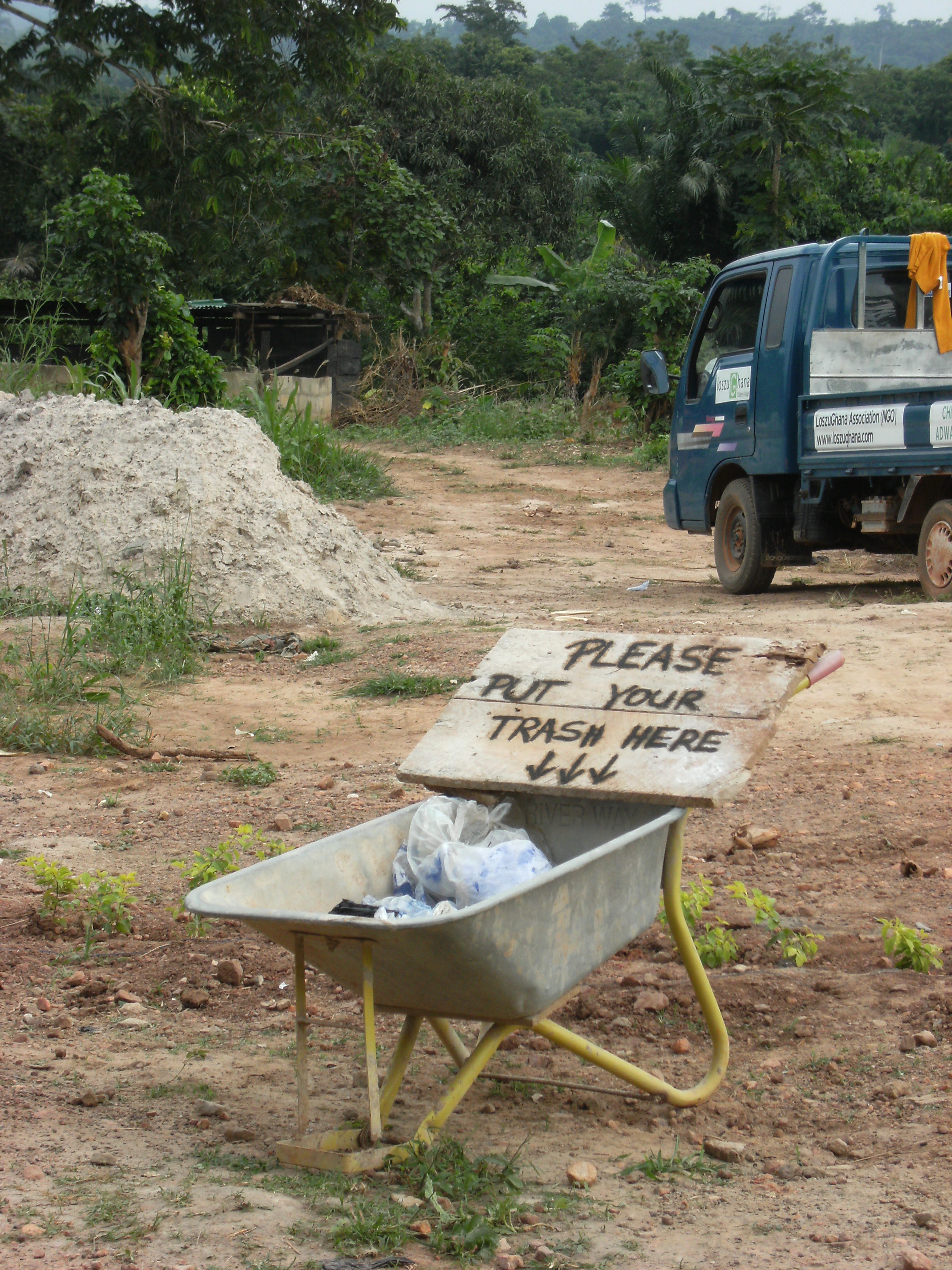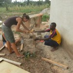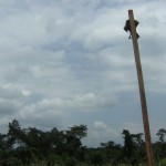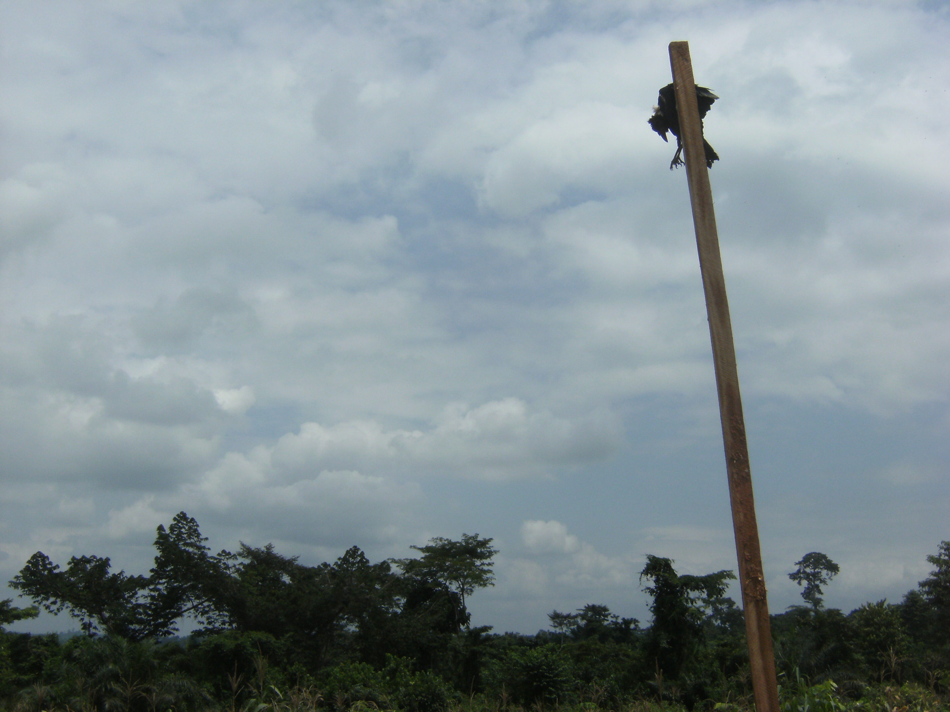 Eine vergleichsweise kleine, aber dennoch sehr lästige und unnötige Herausforderung ist die Entsorgung des im Children’s Village anfallenden Mülls. Den größten Müllberg produzieren die vielen Wassertütchen, die dort getrunken werden. Doch auch schwarze Plasitktüten, Keks- und Kaffeepackungen sowie alte Kleidung, auseinandergefallene Schuhe etc. lassen den Müllberg wachsen. Das bezieht sich übrigens nicht nur auf das Children‘s Village sondern auf ganz Ghana. Ob in der Stadt oder auf dem Land, Wassertüten und schwarze Plastiktüten findet man überall am Straßenrand, in den Abflussgräben, auf freien Flächen. Und mitten drin grasen Schafe, picken Hühner, spielen Kinder. Im Children’s Village haben wir nun ein Schild sowie eine Müllschubkarre und einen eigens zusammengezimmerten Mülleimer. Wir werden sehen, ob und wie lange das funktioniert. Denn da werden selbst Erwachsene zu Kindern, denen man beibringen muss, den Müll nicht einfach dort fallen zu lassen, wo man steht. An der Verbreitung des Mülls sind einige tierische Wesen nicht ganz unschuldig. Es gibt hier in Ghana Vögel, die aussehen wie Elstern, aber viel größer sind, so wie Raben und von den Bewohnern Krähen genannt werden. Nenne ich sie also auch Krähen. Diese Vögel haben es sich zur Spezialität gemacht, Müll auf der Suche nach Futter auseinanderzunehmen. Die Krähen sind dazu Raubvögel, die es im Children’s Village auf die Küken abgesehen haben. Die Müllverteilung ist also in diesem Fall eher das kleinere, wenn auch stets lästige Übel. Was also tun um die Krähen vom Küken stehlen und fressen abzuhalten? Die altmodischen Vogelscheuchen scheinen in diesem Fall nicht zu funktionieren. So mussten wir zu härteren Maßnahmen greifen. Mit einer Steinschleuder wurden zwei Krähen abgeschossen, jeweils an das Ende eines langen Holzmastens genagelt und diese dann aufgestellt. Nicht wirklich sehr tierfreundlich, aber andere Mittel haben versagt. Man möge uns verzeihen.