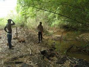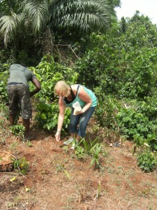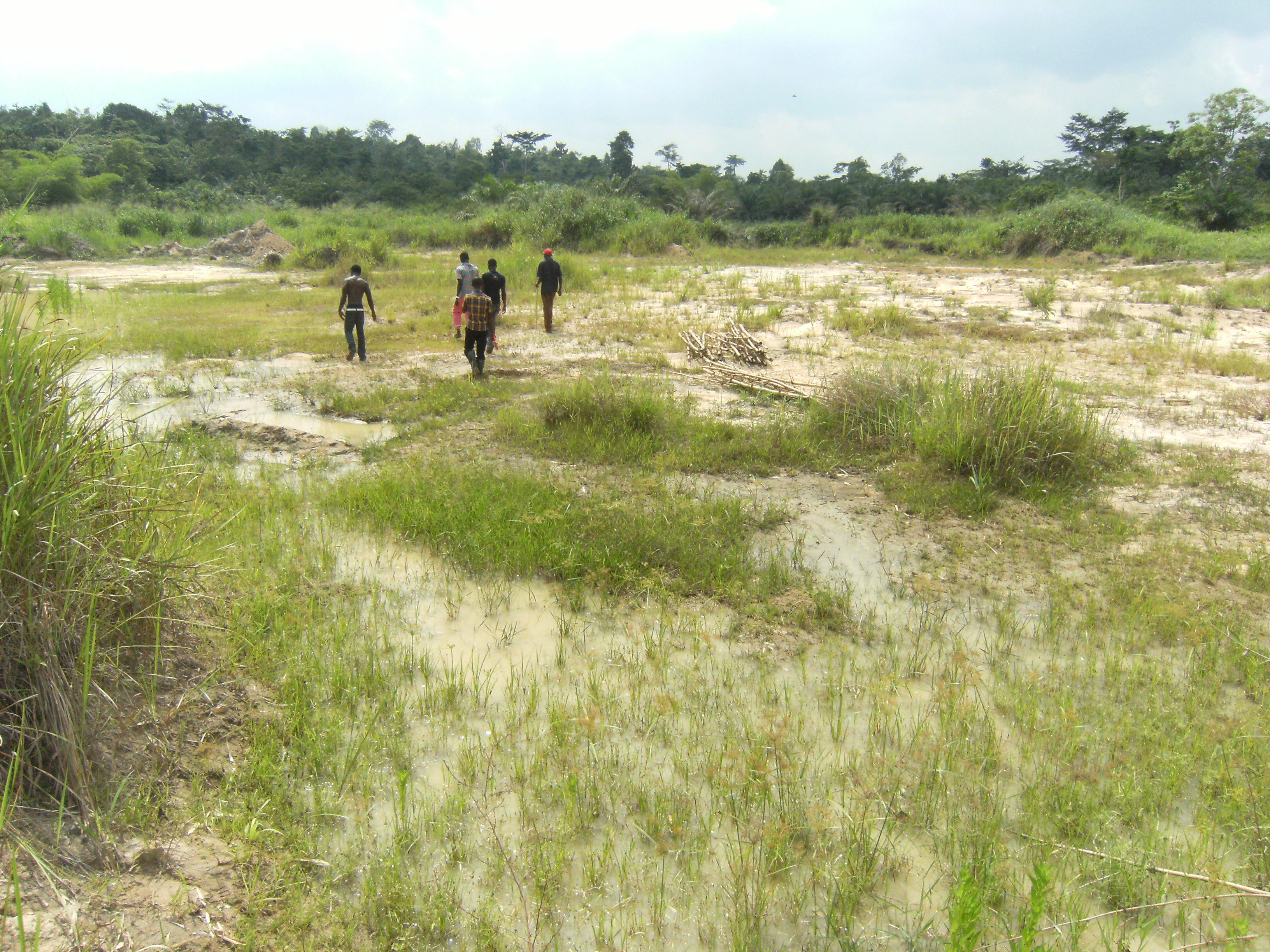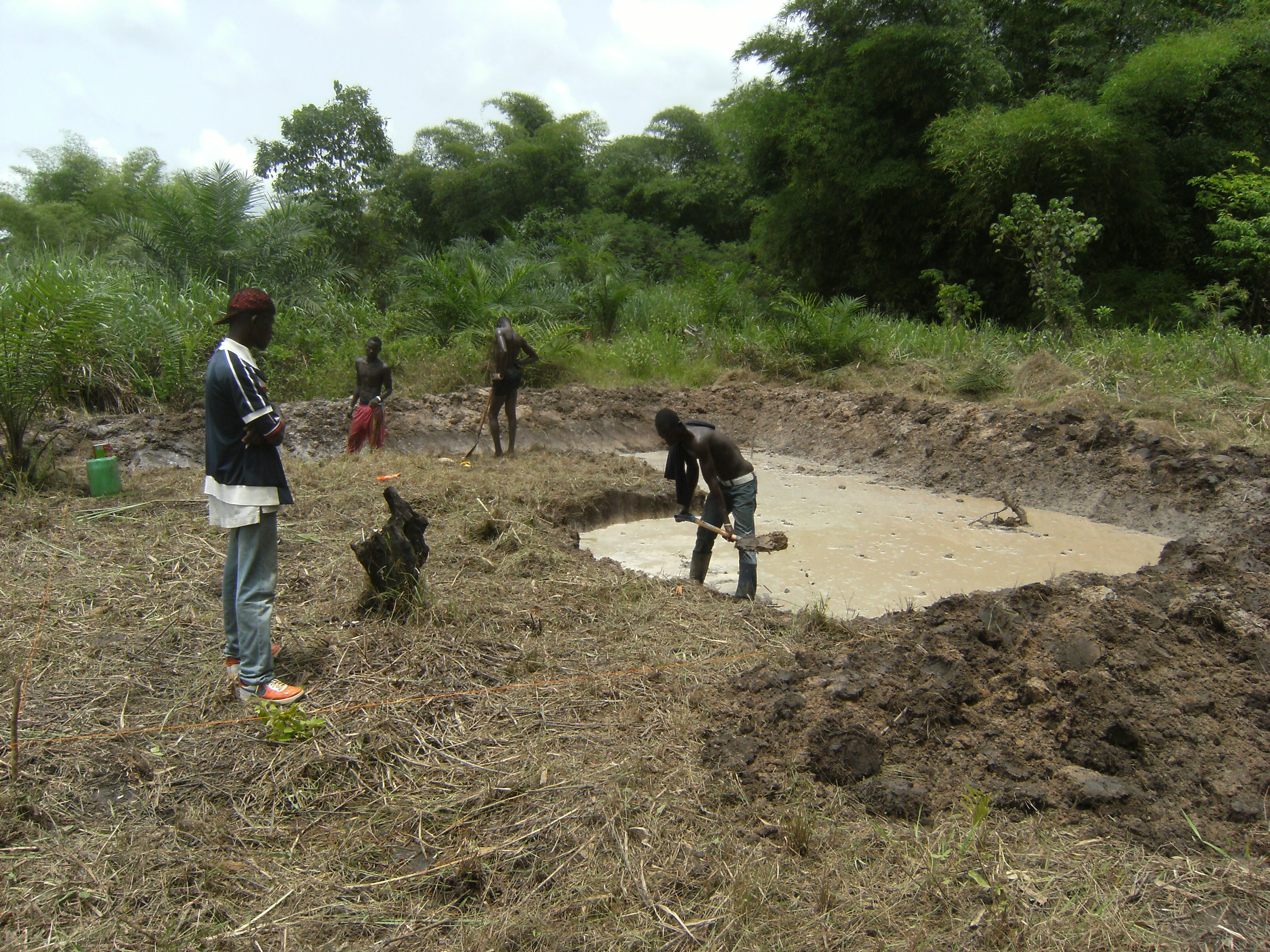Tja, und dann sind da unsere zwei neuen Teilprojekte mit guten Zukunftsaussichten. Seit letzter Woche steigt das Childrens Village in die Fischzucht und in die Palmoelfoerderung ein, zwei ertragsversprechende Bereiche der Landwirtschaft. Hier in Ghana wird viel Fisch gegessen, egal ob an der Kueste oder im Norden. Ein sehr beliebter Fisch ist der Tilapia, ein Suesswasserfisch sowie so genannter Catfish oder Mudfish. Ich glaube, der ist vergleichbar mit Wels. In fast jeder Mahlzeit findet sich hier Fisch in irgendeiner Form. Sei es zermahlen im Porridge am Morgen oder im kleinen Klacks Shito (eine Art Gewuerzpaste) oder als Ganzes zu Banku. Der Bedarf ist gross und da die Kuesten immer leerer gefischt werden (allerdings nicht von den lokalen Fischern sondern von den internationalen Fischereien), gewinnen Suesswasserfische immer mehr an Bedeutung. Und nun sind wir mittendrin. Ich muss zugeben, dass ich absolute keine Fischexpertin bin und keinen Fisch esse (fuer die meisten Ghanaer unvorstellbar), aber das Projekt Fischfarm wird spannend. Seit letzter Woche gehoeren und uns nun also zwei Hektar Land in der Naehe eines kleinen Flusses. Aus Sunyani, der Regionalhauptstadt der Brong-Ahafo-Region, haben wir uns Hilfe von professionellen Fischfarmarchitekten geholt. Nach einer ausfuehrlichen Beratung und einer Gelaendebegehung werden wir mit vier Fischteichen in der Groesse von jeweils 10×10 Metern beginnen. Dort werden sich dann in Zukunft bis zu 300 Fische tummeln (drei Fische auf einem Meter), die wir gewinnbringend auf dem Markt verkaufen koennen (ein Kilo Tilapia kostet ca. 15 Cedis und mehr). Aehnlich wie der Brunnenbau vor einigen Monaten werden die vier Teiche ohne Hilfe von Maschinen gegraben. Statt einem grossen Bagger schwingen vier Arbeiter von Sonnenaufgang bis –untergang die Schaufel, stehen stundenlang im Matsch und wollen bis in drei Wochen mit der Arbeit fertig sein. Ich bin da ebenso positiv eingestellt, denn bereits nach weniger als einem Tag Arbeit haben die vier eine Menge geschafft. Die Fischteiche werden einen natuerlichen Wasserzulauf, gespeist aus dem Flusslauf, bekommen und so die besten Bedingungen fuer guten Fisch bieten.