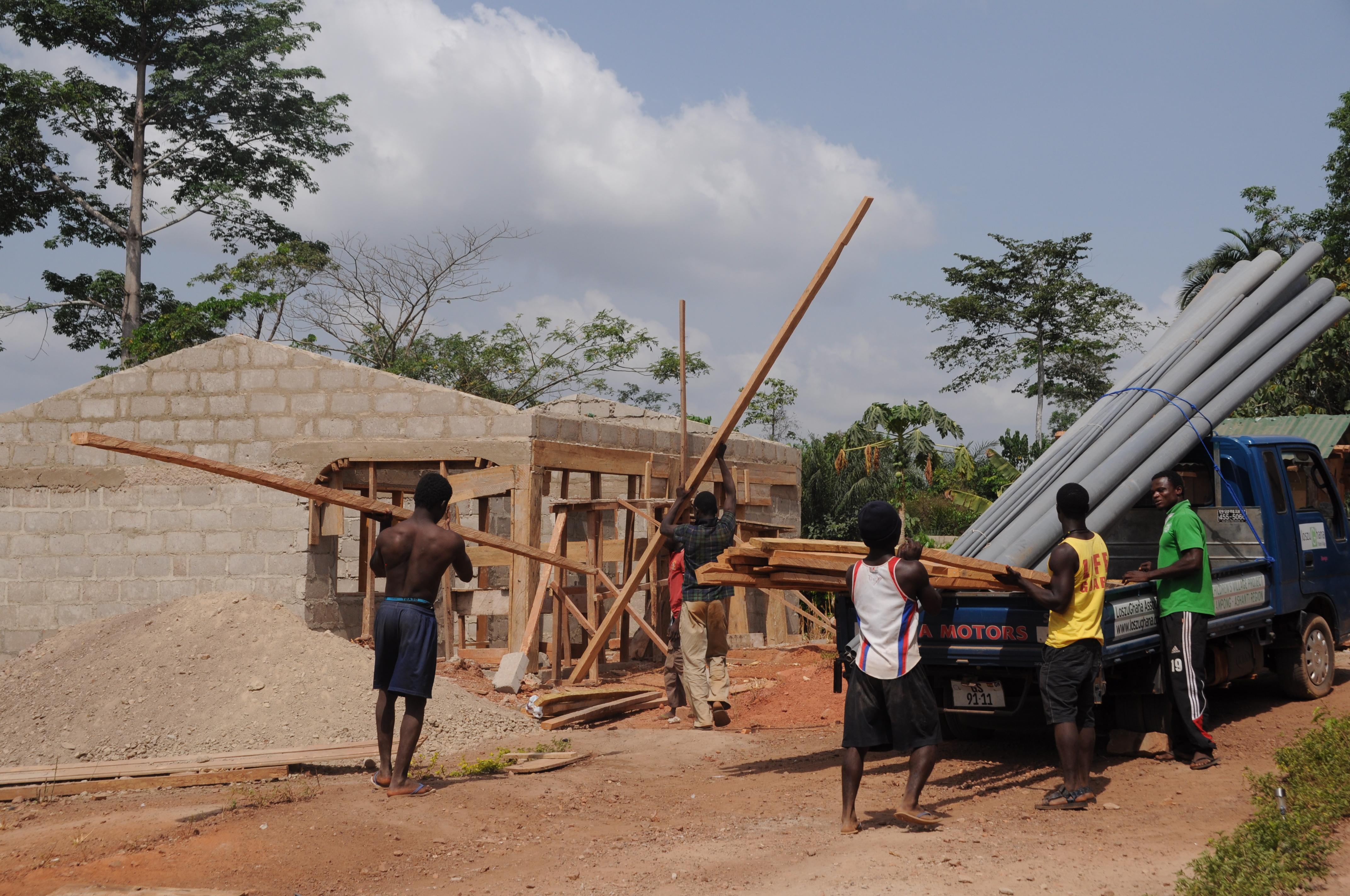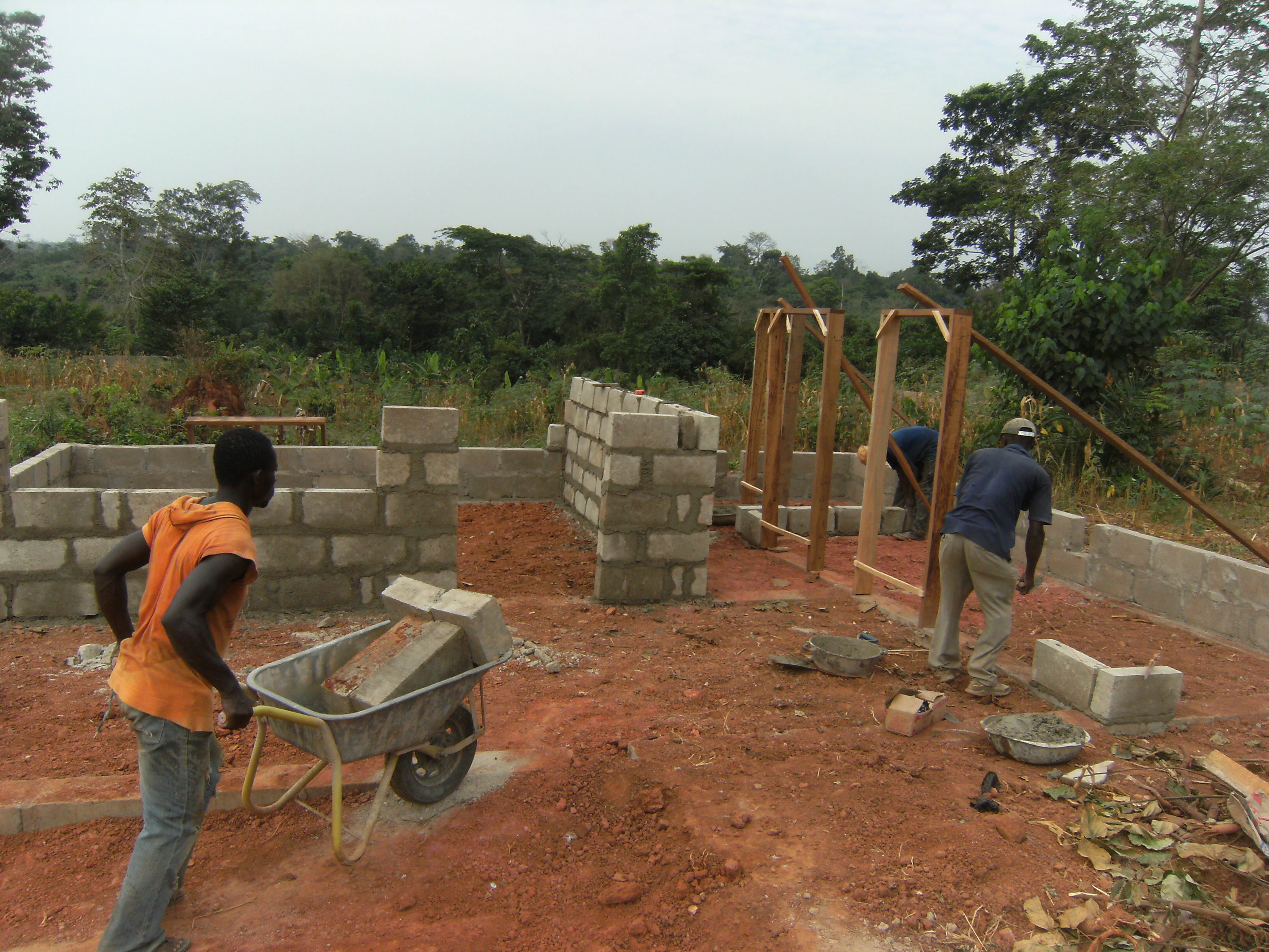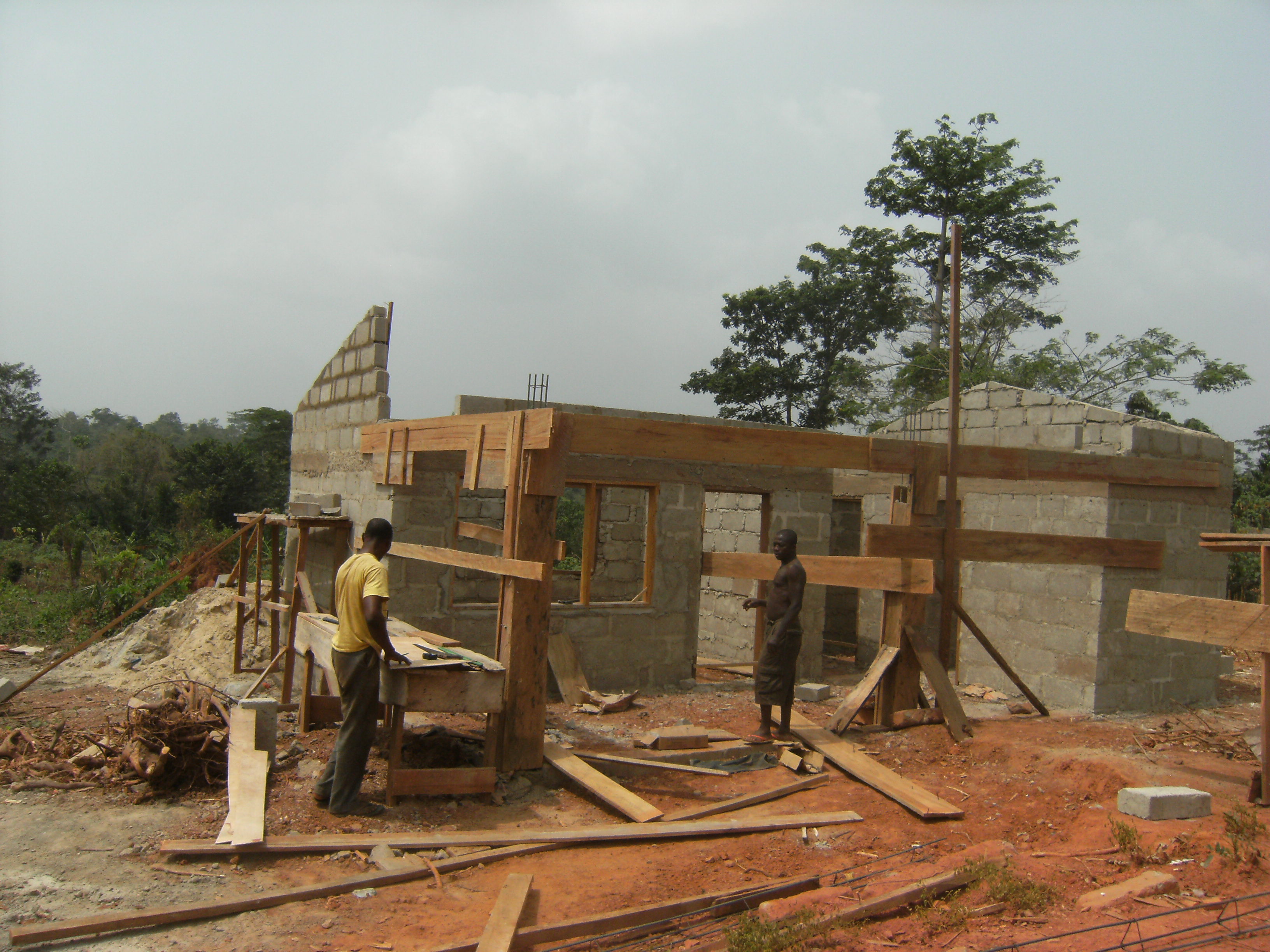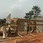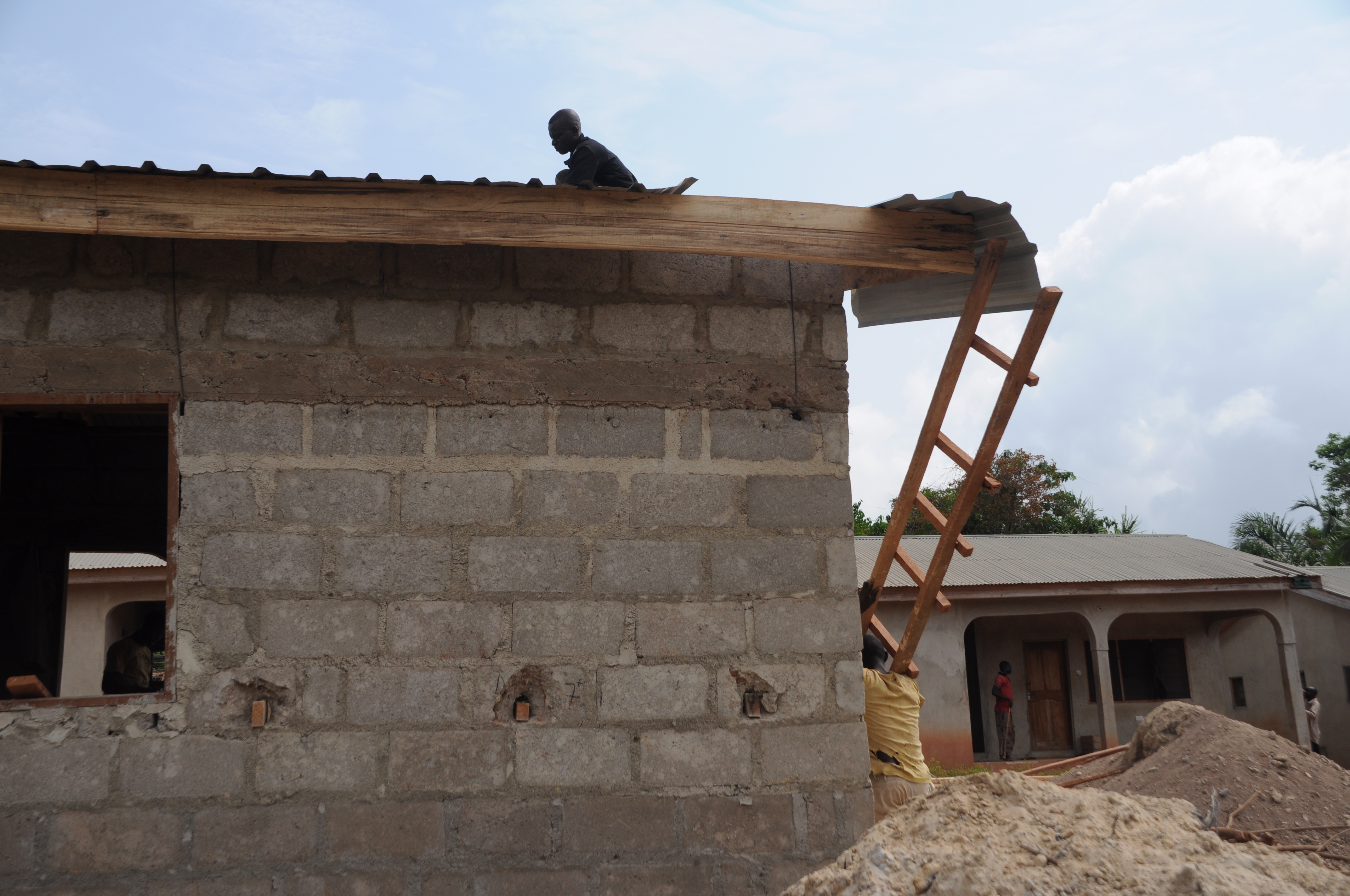 Die Arbeiter und Freiwilligen im Children’s Village wachsen mal wieder über sich hinaus. Mittlerweile ist das sechste Familienhaus bereits wie die anderen mit dunkelgrünem Dachwellblech gedeckt.  Außerdem wird die Lücke zwischen den beiden Mauerenden langsam geschlossen.