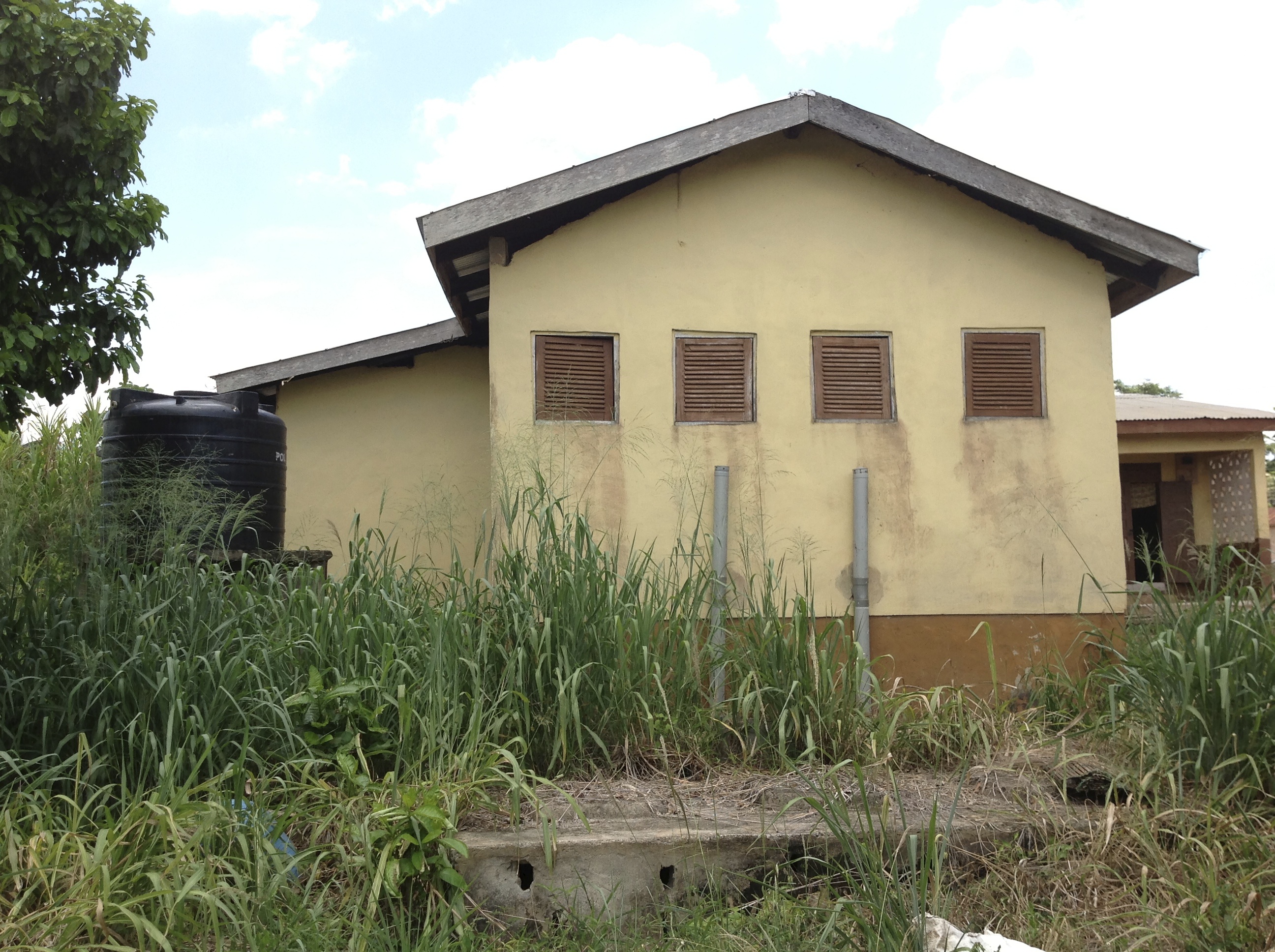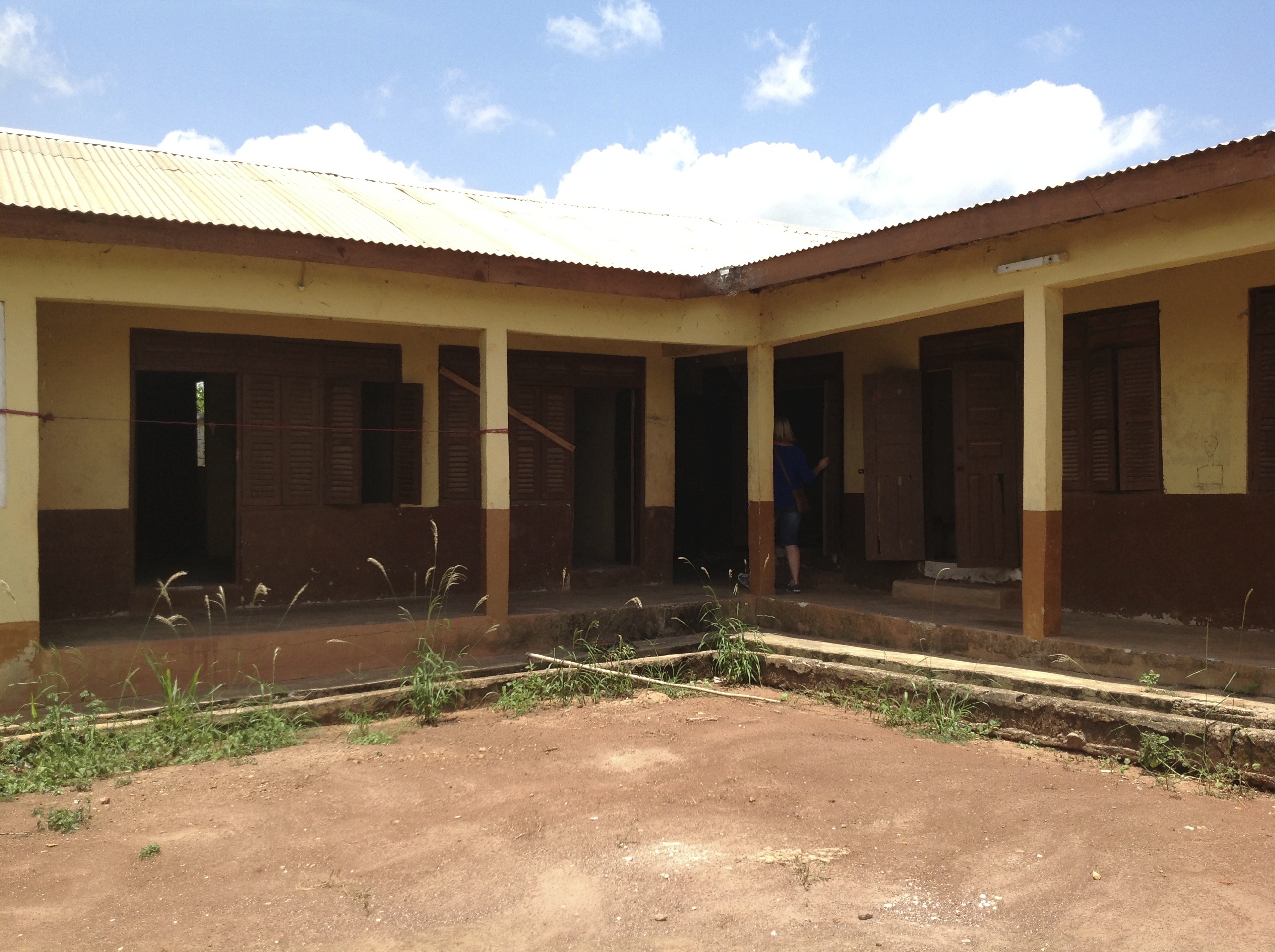 Seit 2006 steht in Old Adwampong ein Gebäude mit zwei großzügig geschnittenen, zwei weitaus kleineren Räumen sowie vierfachen Sanitäranlagen. Der gelb-braune Außenanstrich verrät, dass es sich um eine öffentliche Schule handelt. Oder besser gesagt: handeln sollte. Denn seit dem Bau im Jahr 2006 hat niemals ein Kind oder ein Lehrer auch nur einen Fuß in die Klassenräume gesetzt, nie wurden dort das Alphabet und das Einmaleins aufgesagt und nie Stühle schnell zurückgeschoben, wenn die Pausenglocke ertönte. Warum das so ist….darüber lässt sich in viele Richtungen spekulieren. Doch statt unsere Zeit mit wilden Spekulationen zu verbringen, gehen wir nun die ersten Schritte, um aus der Pseudo-Schule eine reale Schule werden zu lassen.