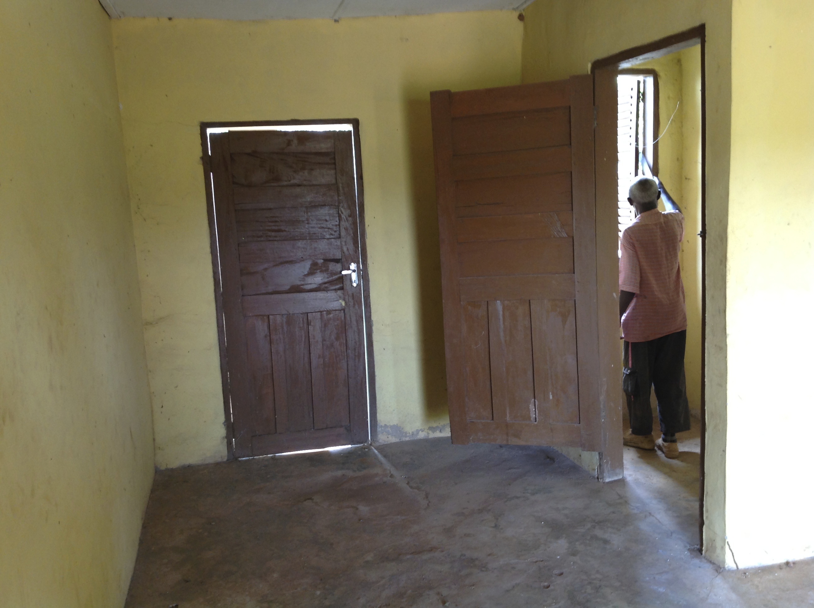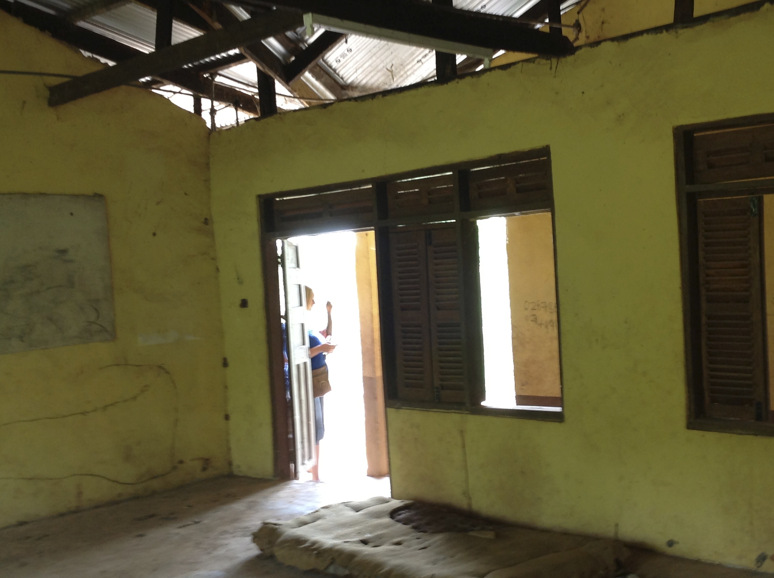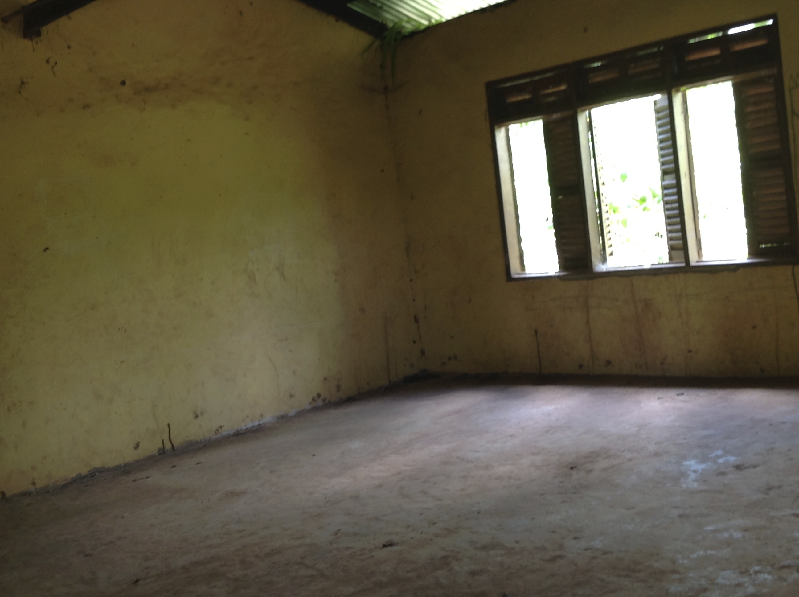 Vor wenigen Tagen haben wir dem Gelände und dem Gebäude einen ersten Besuch abgestattet. Das Schulgebäude besteht aus zwei großen Klassenräumen sowie zwei kleineren Räumen, die als Büros inklusive Stauräumen genutzt werden können. Außerdem verfügt die Schule über gute Sanitäranlagen, also WCs und fließend Wasser und sogar eine Dusche. Das Schulgebäude ist an das Stromnetz angeschlossen. Alle Räume stehen leer, nur die Dorfbewohner nutzen es ab und zu für Gottesdienste und Versammlungen. Noch nicht einmal Stühle, Tische oder sonstige Materialien, die das Gebäude als Schule erkennen lassen, haben ihren Weg dorthin gefunden. Viele der Fenster- und Türrahmen sind bereits von Termiten zerfressen. Hornissen haben in den Balken mit dem Nestbau begonnen. Das Gras auf dem Gelände wächst mannshoch, Spielgeräte sucht man vergeblich.