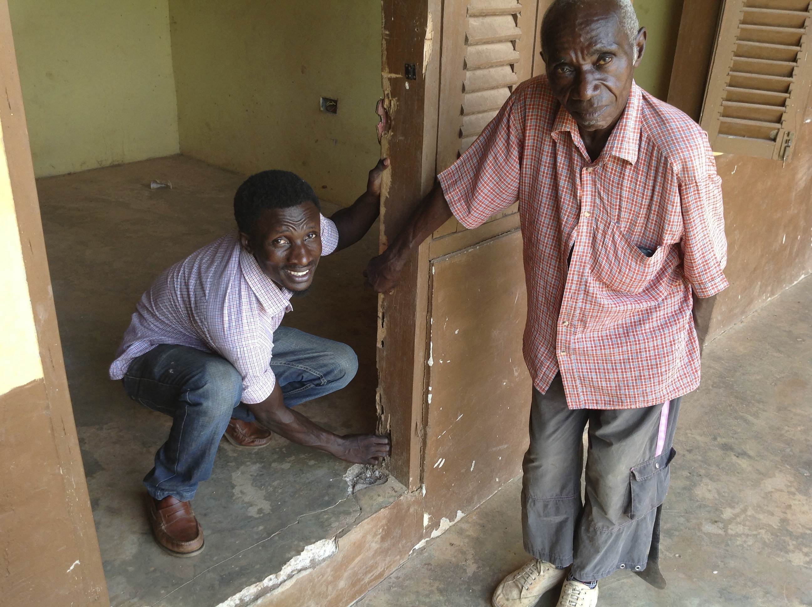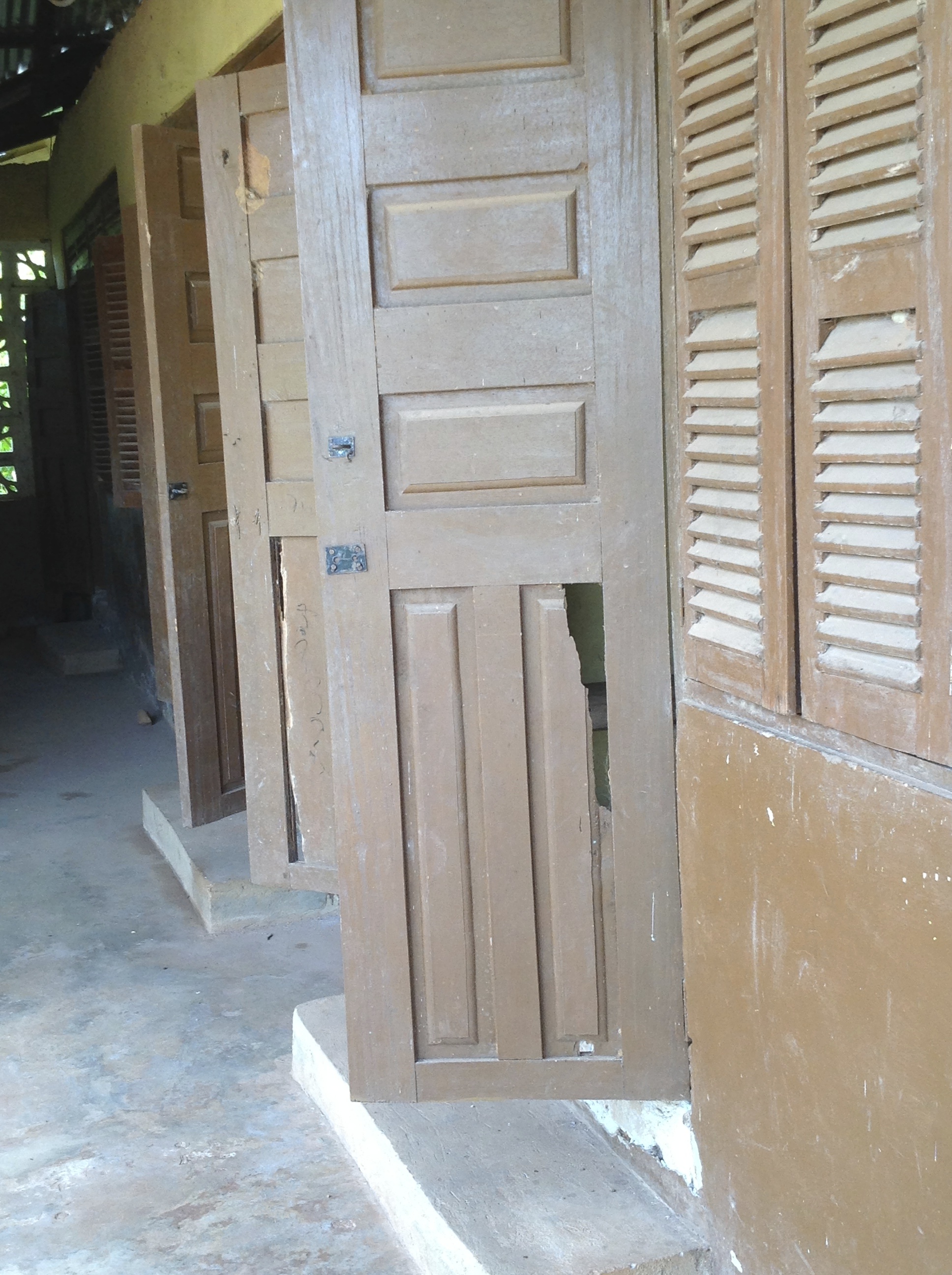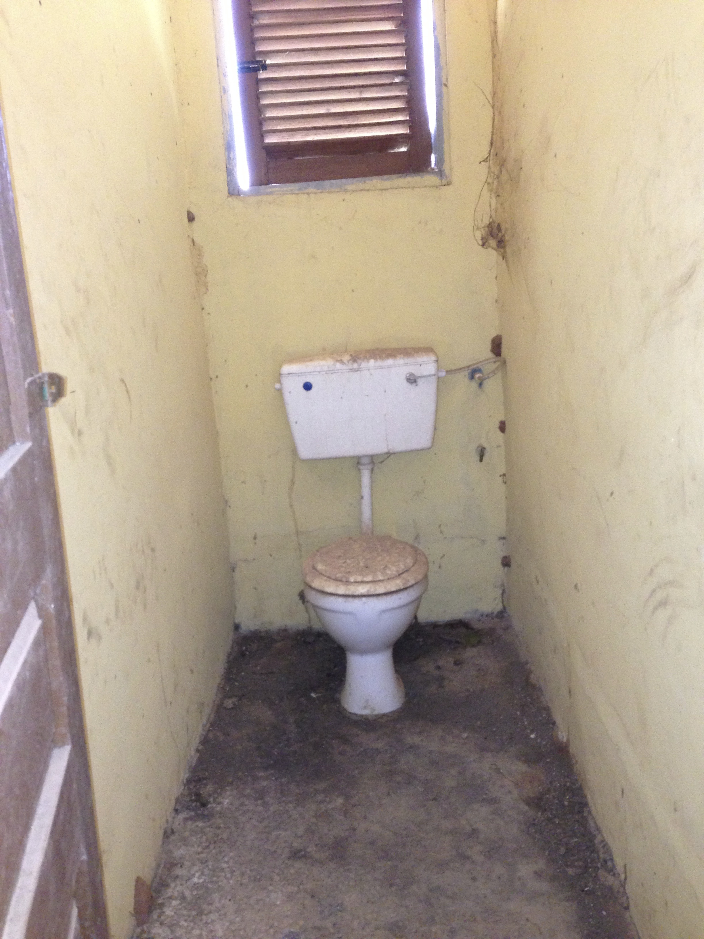 Vor wenigen Tagen haben wir dem Gelände und dem Gebäude einen ersten Besuch abgestattet. Das Schulgebäude besteht aus zwei großen Klassenräumen sowie zwei kleineren Räumen, die als Büros inklusive Stauräumen genutzt werden können. Außerdem verfügt die Schule über gute Sanitäranlagen, also WCs und fließend Wasser und sogar eine Dusche. Das Schulgebäude ist an das Stromnetz angeschlossen. Alle Räume stehen leer, nur die Dorfbewohner nutzen es ab und zu für Gottesdienste und Versammlungen. Noch nicht einmal Stühle, Tische oder sonstige Materialien, die das Gebäude als Schule erkennen lassen, haben ihren Weg dorthin gefunden. Viele der Fenster- und Türrahmen sind bereits von Termiten zerfressen. Hornissen haben in den Balken mit dem Nestbau begonnen. Das Gras auf dem Gelände wächst mannshoch, Spielgeräte sucht man vergeblich.