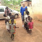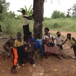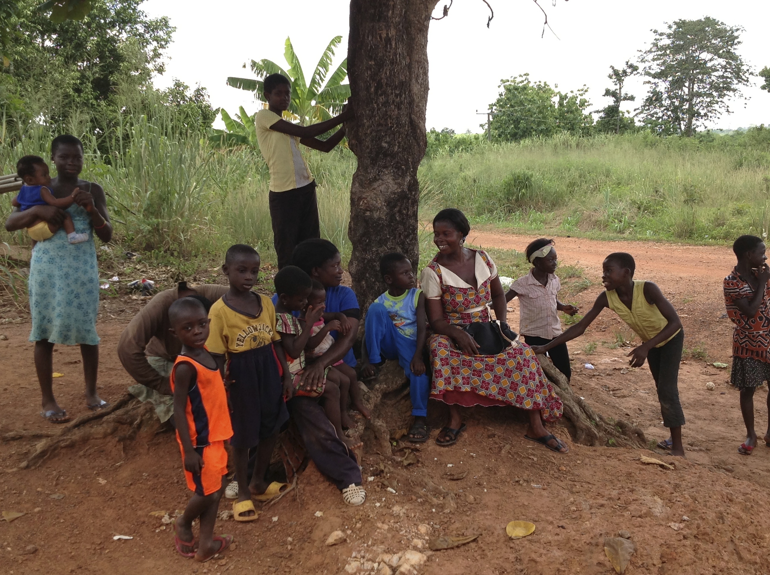 Es sind nur ein paar Schritte bis ins Dorf. Und genau dahin machen wir uns auf, um ungefähr einen Eindruck zu bekommen, wie viele Dorfkinder von einer Belebung der Schule profitieren könnten. Zunächst noch schüchtern und dann doch neugierig kommen immer mehr Kinder zusammen. Wir schätzen, dass alleine aus dem Dorf 15 bis 20 Kinder von der Einrichtung der Schule profitieren können. Zuzüglich der Kinder aus dem Children’s Village ist das eine gute Größe für eine Zwergenschule. Es wird ein Kindergarten werden für die Jüngsten im Dorf, für all die, die noch zu jung sind, um die Schule im Nachbardorf zu besuchen. Gerade für die jüngeren Kinder, so erzählt der Dorfälteste Mr. Boateng, ist es zuviel, jeden Tag den weiten Weg zur Schule und wieder zurück zu laufen. So gehen einige nur alle zwei Tage zur Schule. Mit den Kindern, die sich bei unserem Besuch vor Ort befinden – es sind gerade Ferien, deshalb sind auch ältere Kinder zu sehen – „üben“ wir schonmal den Morgenappell. Auf die Frage, ob sie auch gerne die Schule besuche wollen, nicken alle eifrig mit dem Kopf.