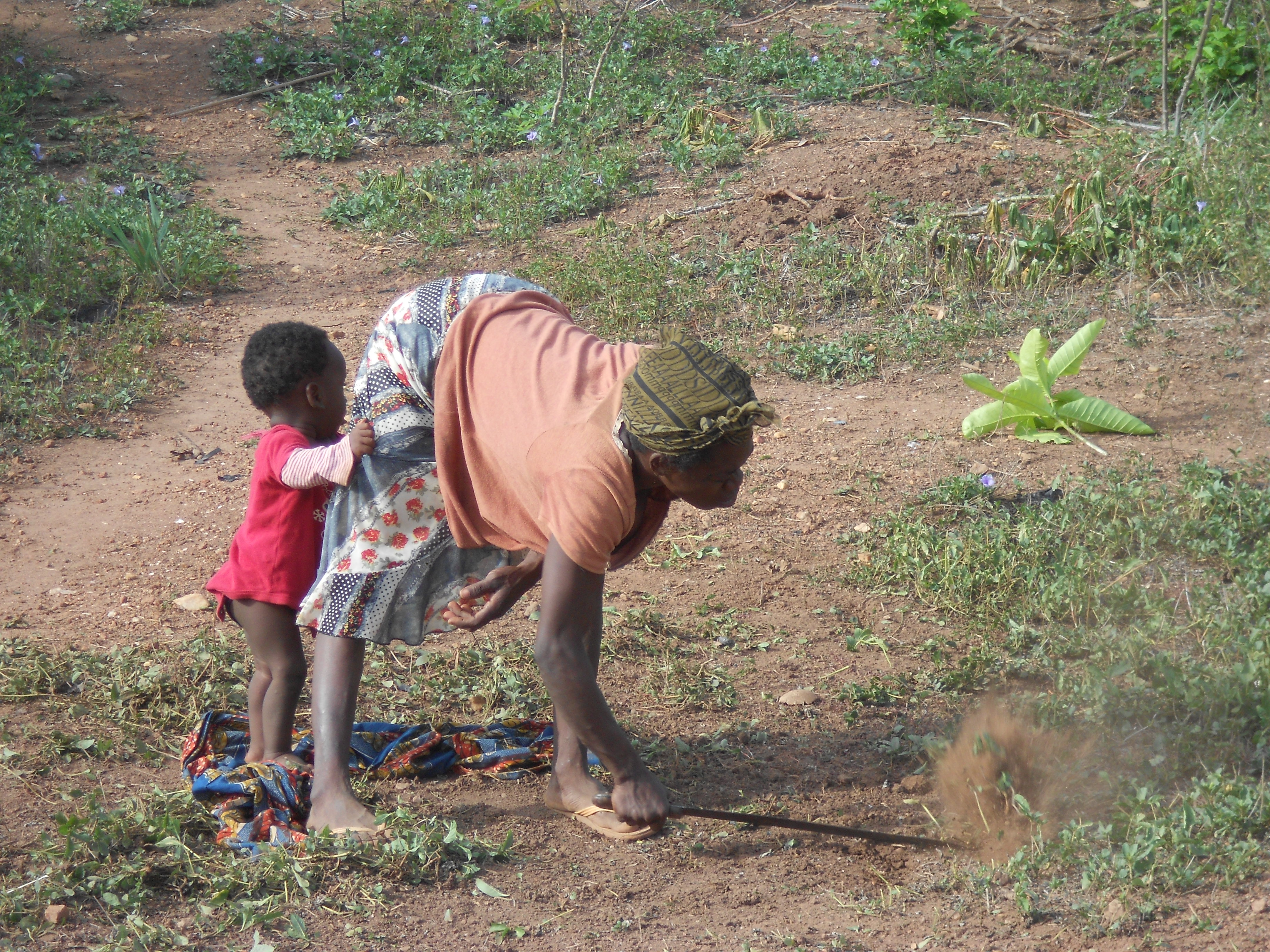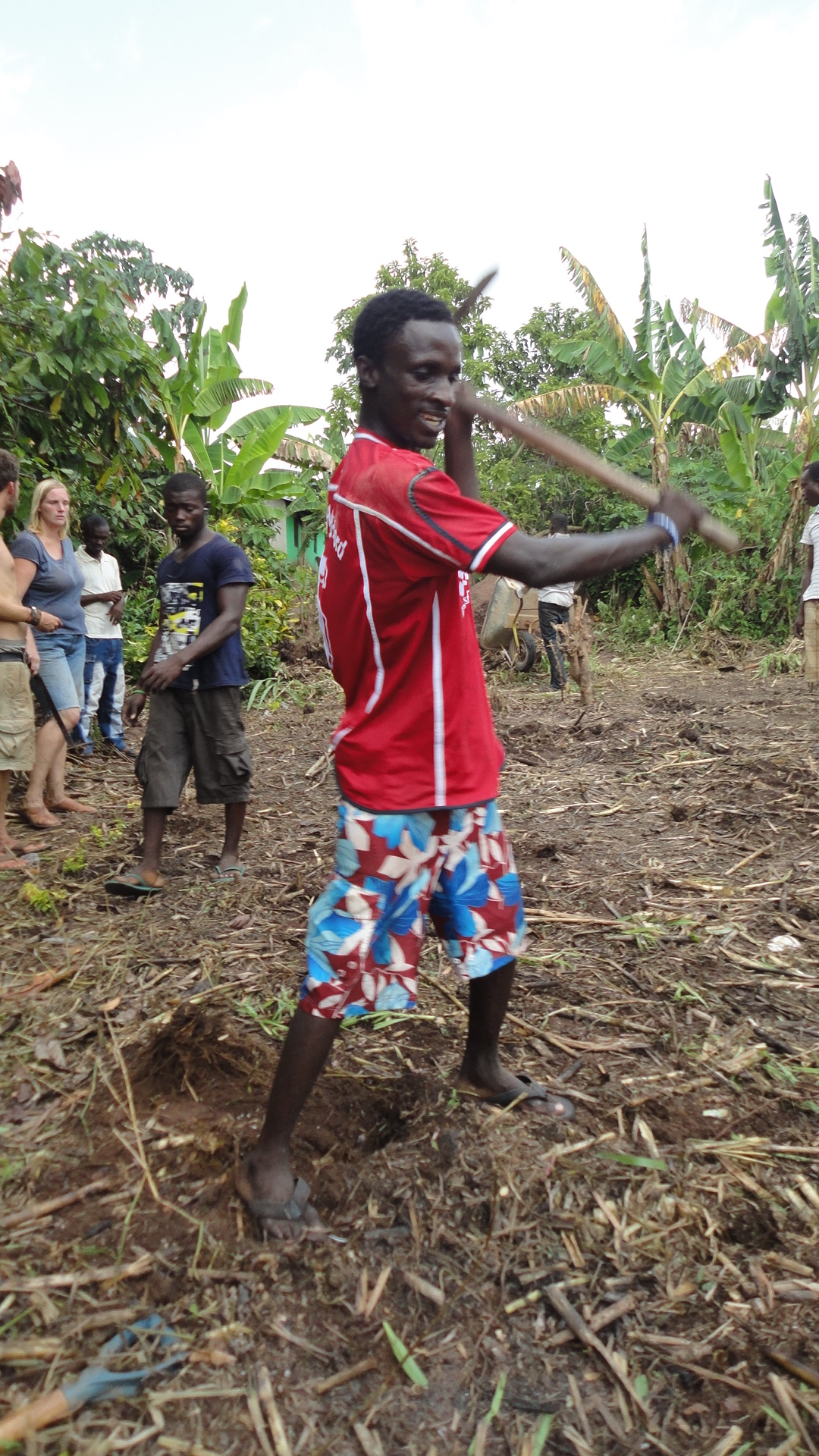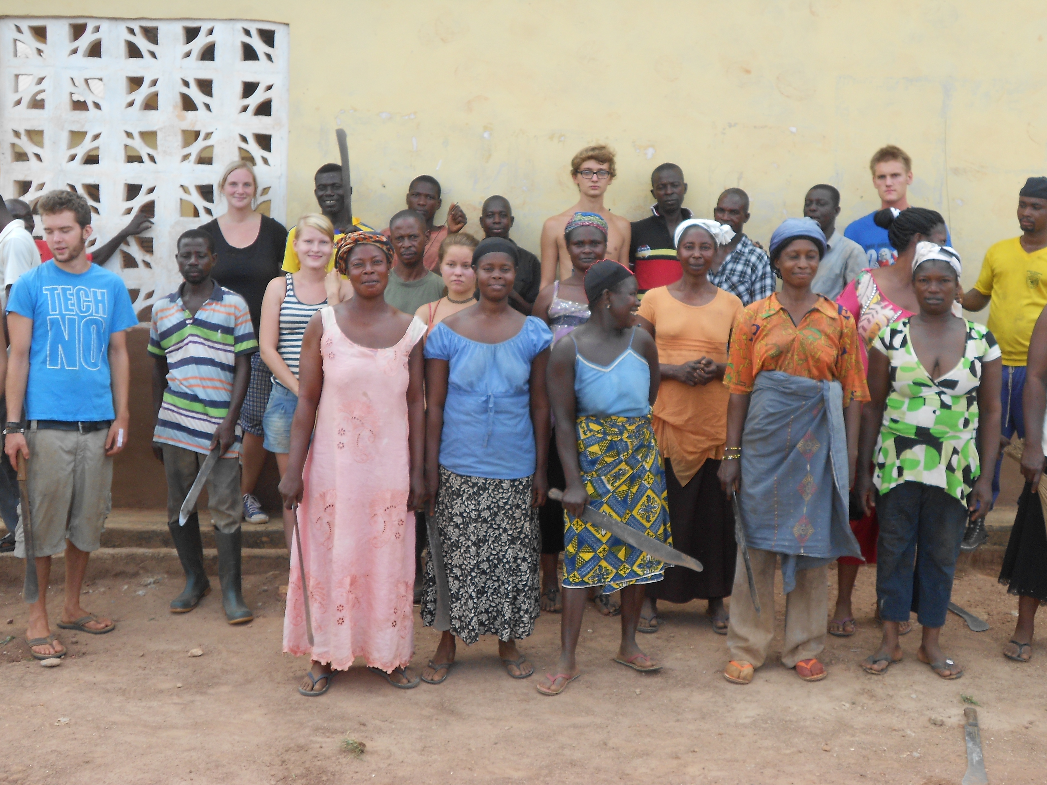 Jeden Dienstag ist in Old Adwampong der so genannte Dorfgemeinschaftstag. Statt wie sonst täglich Feldarbeit zu verrichten, versammeln sich an diesem Tag die Dorfbewohnerinnen und –bewohner und arbeiten zusammen im Dorf an unterschiedlichen Orten. Seitdem klar ist, dass wir die Schule wiederbeleben, helfen alle kleinen und großen Leute dabei, das Schulgelände von Unkraut und Müll zu befreien.