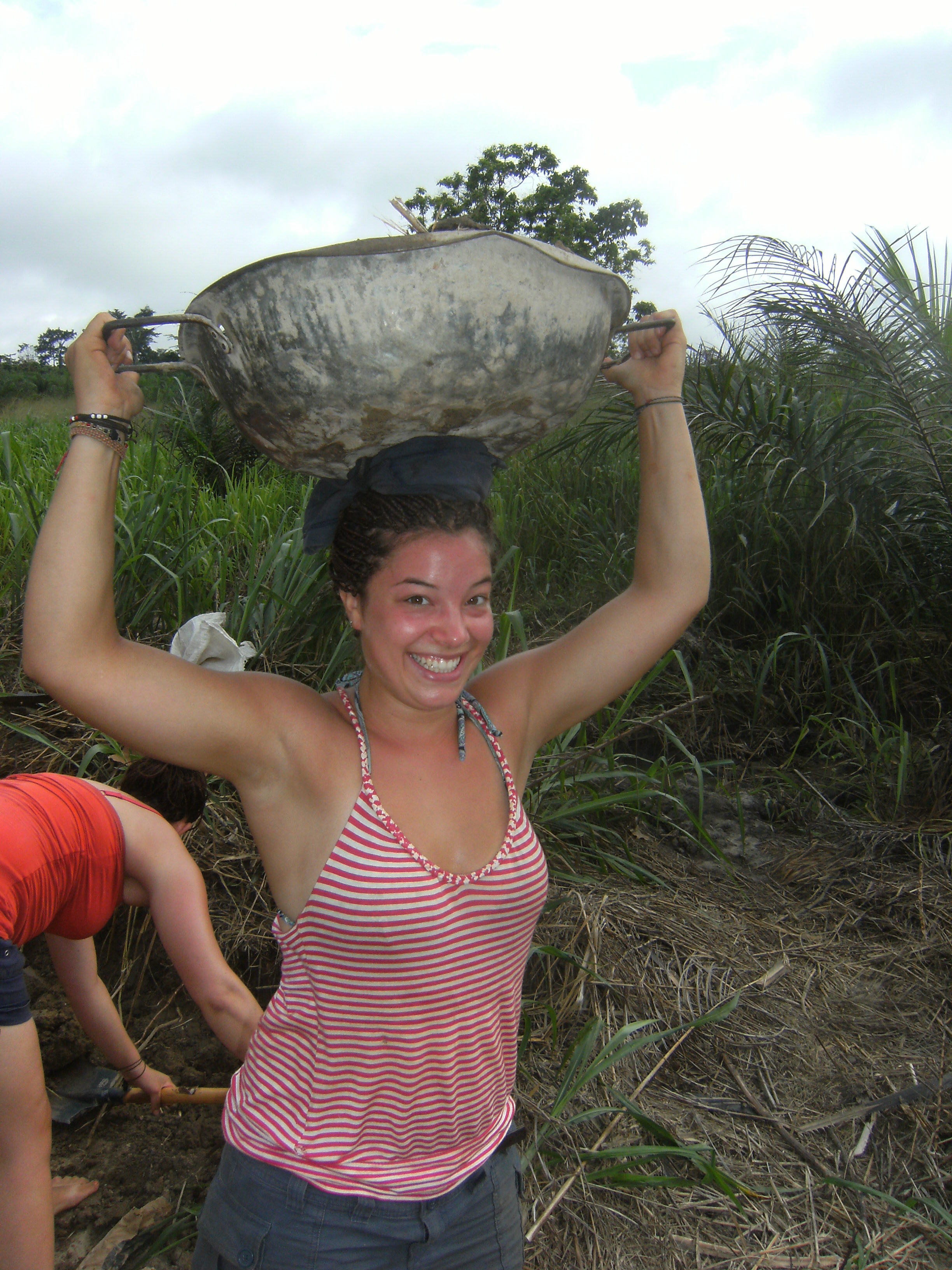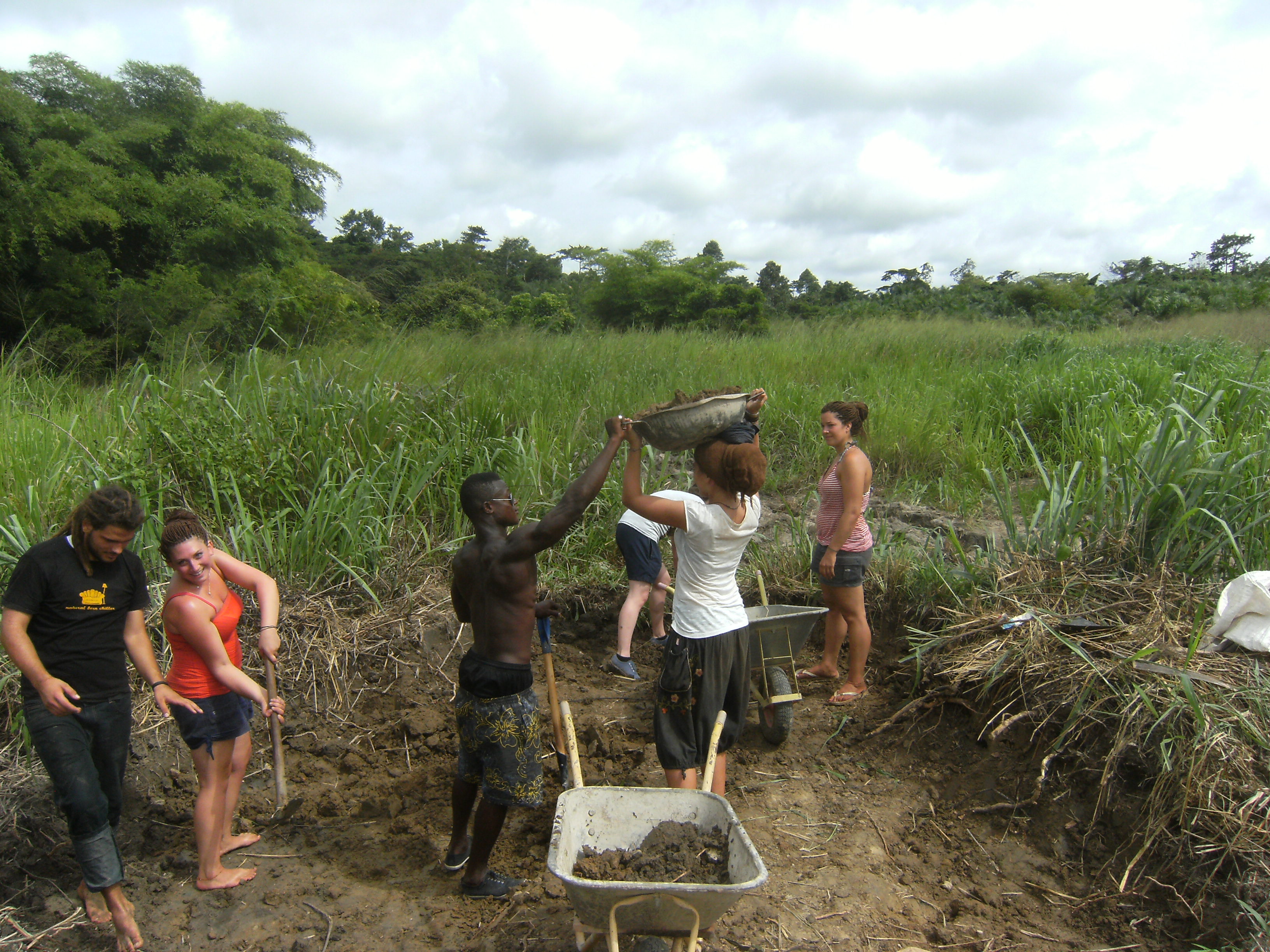 Noch mehr Sand wurde bei den Fischteichen geschaufelt, auf dem Kopf getragen und mit Schubkarren weggerollt. Der staerker werdende Regen verstaerkt die Bodenerosion. Mit jedem Regenguss werden Teile der Sandwaelle um die Fischteiche ins Wasser gespuelt. Wir haben bereits Graeser gepflanzt, um sie Erosion einzudaemmen, aber bis die gross und stark sind, vergeht noch einige Zeit. Bis dahin haeufen wir neuen Sand auf die Waelle. So entsteht im Nebeneffekt ein Entwaesseungskanal fuer das viele Regenwasser.