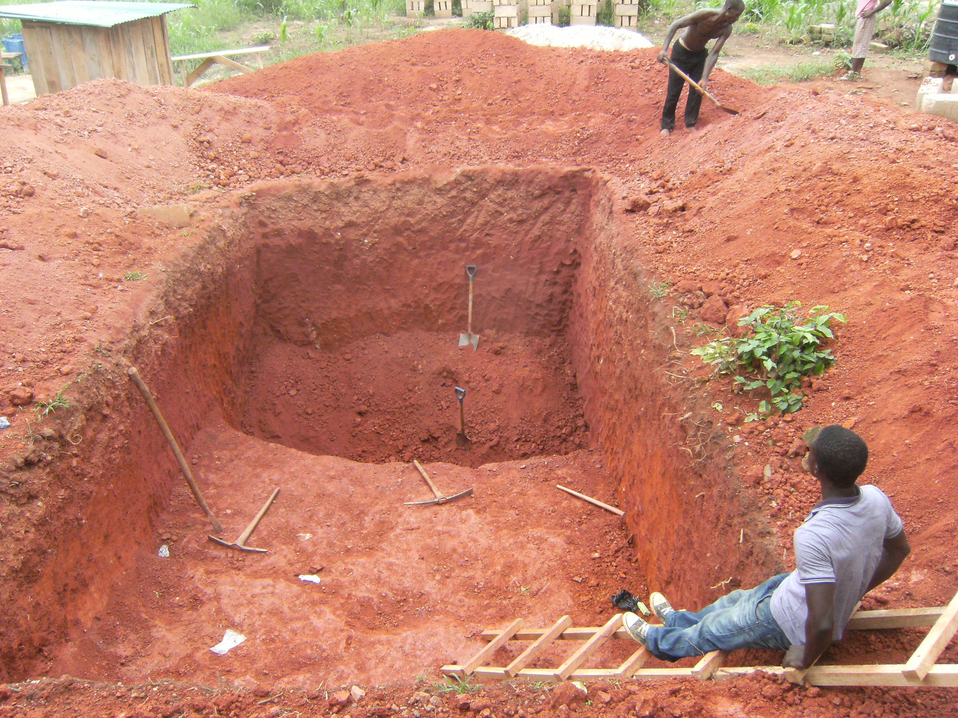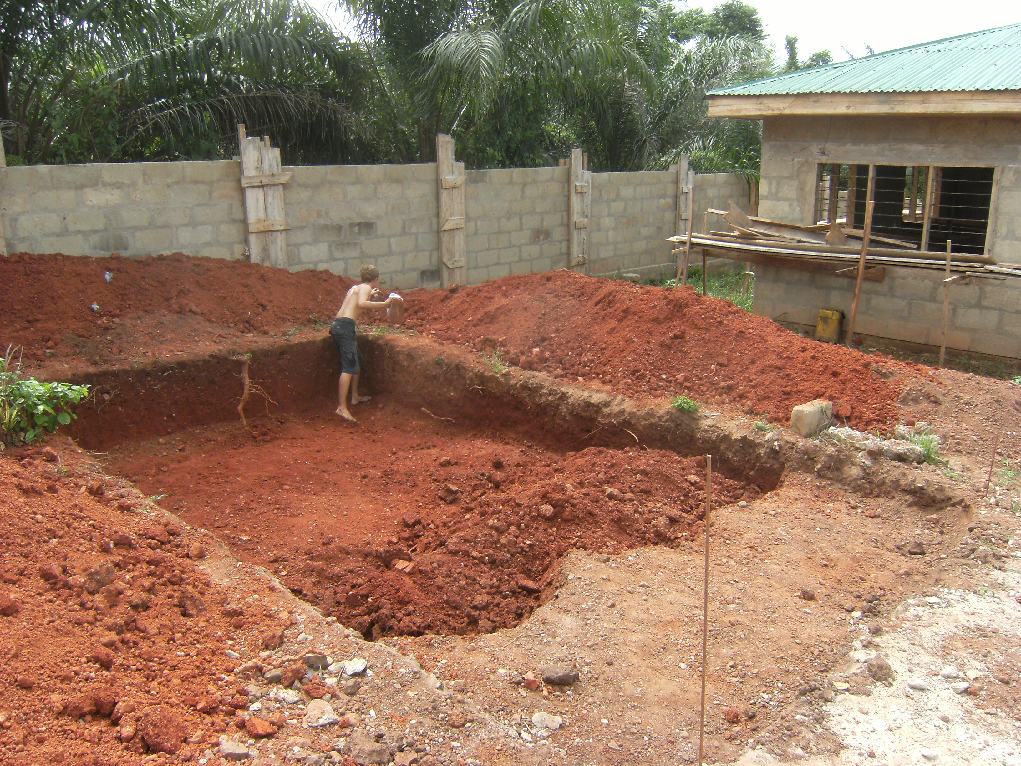 Das zweite Grossprojekt ist die Sache mit den Toiletten und der Kanalisation. Seit ca. zwei Wochen wird zwischen der Kueche und Haus Nr. 5 gebuddelt, was die Armmuskeln hergeben. Die Arbeiter haben sich dafuer in zwei Gruppen aufgeteilt und arbeiten von morgens bis abends an der Aushebung des Manholes. Gruppe A an Tag 1, Gruppe B an Tag 2, dann wieder Gruppe A und so weiter. Quasi im Tagschichtsystem. Es ist wirklich Knochenarbeit. Der Boden hat teilweise die Konsistenz von lehmigem Sand. Das Manhole, sozusagen die Sammelgrueb fuer alles, was durch die Kanalisation rauscht, ist ca. 10 x 15 Meter gross und ca. 3 bis 4 Meter tief werden. Fast so, wie das Sprungbecken im Freibad. Zunaechst wird der Boden mit der Spitzhacke geloest und dann ausgehoben. Und das wird alles mit der Hand ausgehoben, Schaufel fuer Schaufel. In der Grueb arbeiten zwei und oben auch mindestens einer, der den Sand weiterschiebt. Das ist dann auch das, was wir, die Samstagsbesucher, machen. Anstrengend, aber gut.