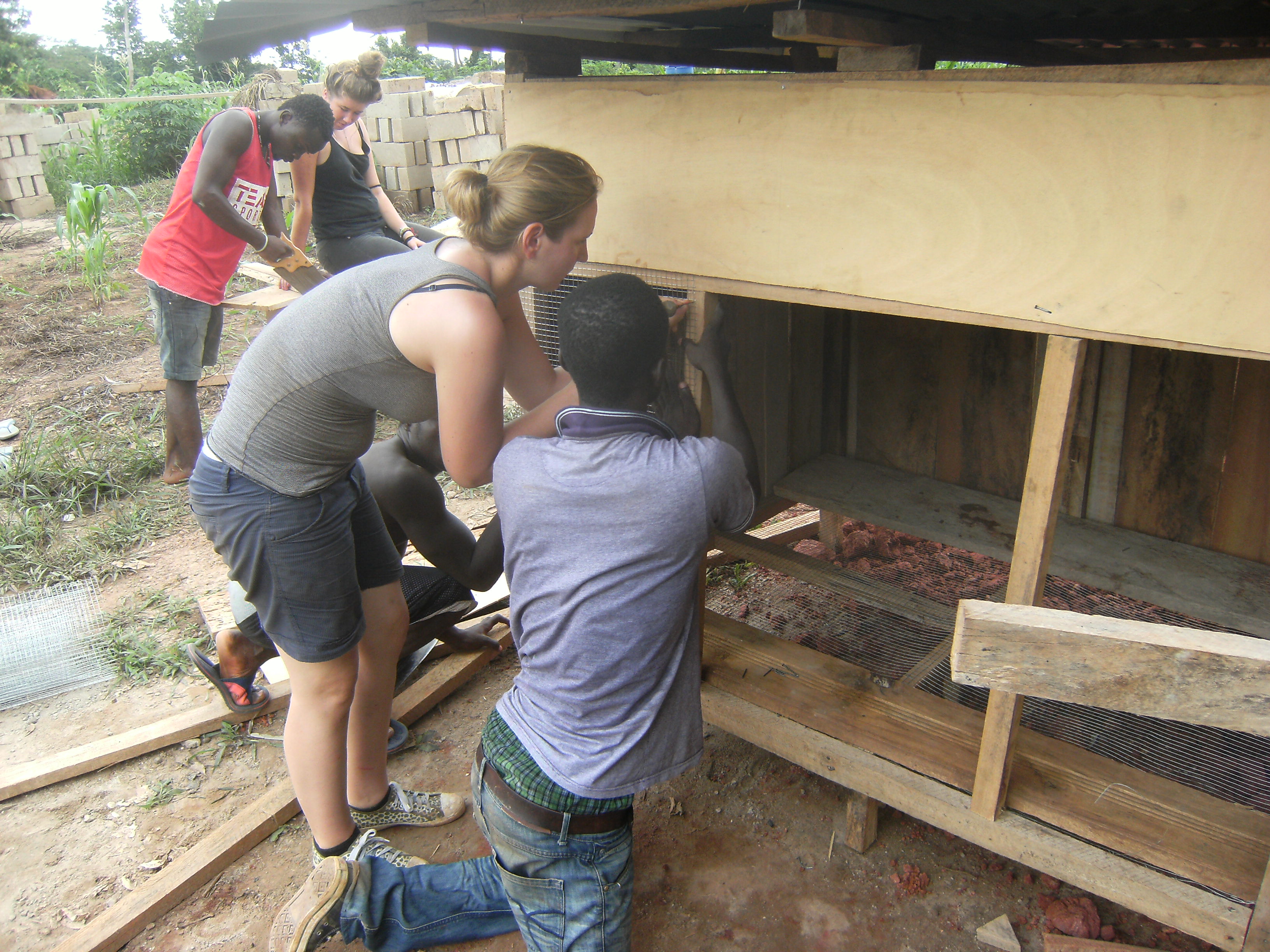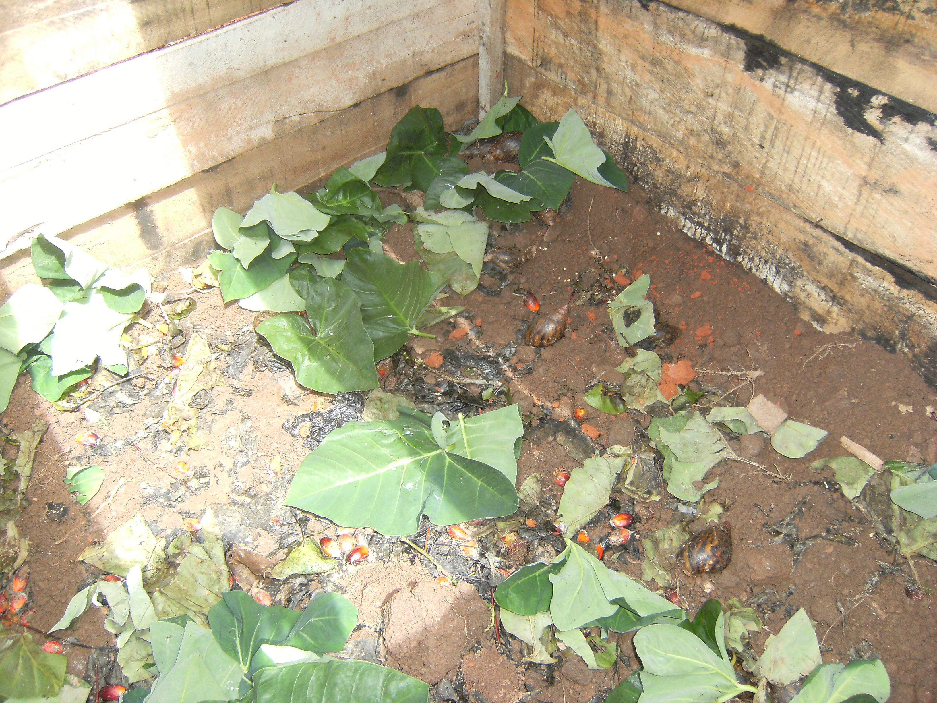 Und was versteckt sich in den grossen schwarzen Holzbox? Alle Tage gehen sie aus und bleiben dennoch zu Haus‘. Was kann das nur sein? Eine Schneckengrossfamilie! Ja, ihr lest richtig, seit ein paar Wochen sind wir unter die Schneckenzuechter gegangen. Diese Kriechtiere sin hier in Ghana eine nahrhafte, jedoch nicht ganz billige Delikatesse. Pro Stueck kosten sie ca. 3 bis 4 Cedis. Zubereitet werden sie meist in Suppen ud so weiter. Ich muss zugeben, dass ich mich da noch nicht rangetraut habe. Aber es geht ja auch nicht um mich, sondern darum, dass wir moeglichst viele davon zuechten und gewinnbringend verkaufen wollen. Diese Schnecken werden wirklich gross, sind aber recht anspuchslos. Fressen Cocoyamblaetter und andere Blaetter, also ein bisschen wie die ungeliebten Gartenschnecken in Deutschland. Damit sie sich nicht ueber unseren Gemuesegarten hermachen, habe sie eine grossen Holzbox als neues zu hause bekommen. So bleibt ihnen die Suche nach einem trockenen, kuehlen Platz erspart und auch fuer ihr Futter muessen sie nicht mehr weit kriechen. Wir werden sehen, ob sie sich halten und fleissig vermehren. Die ersten haben schon Eier gelegt. Wir koennen also hoffen.