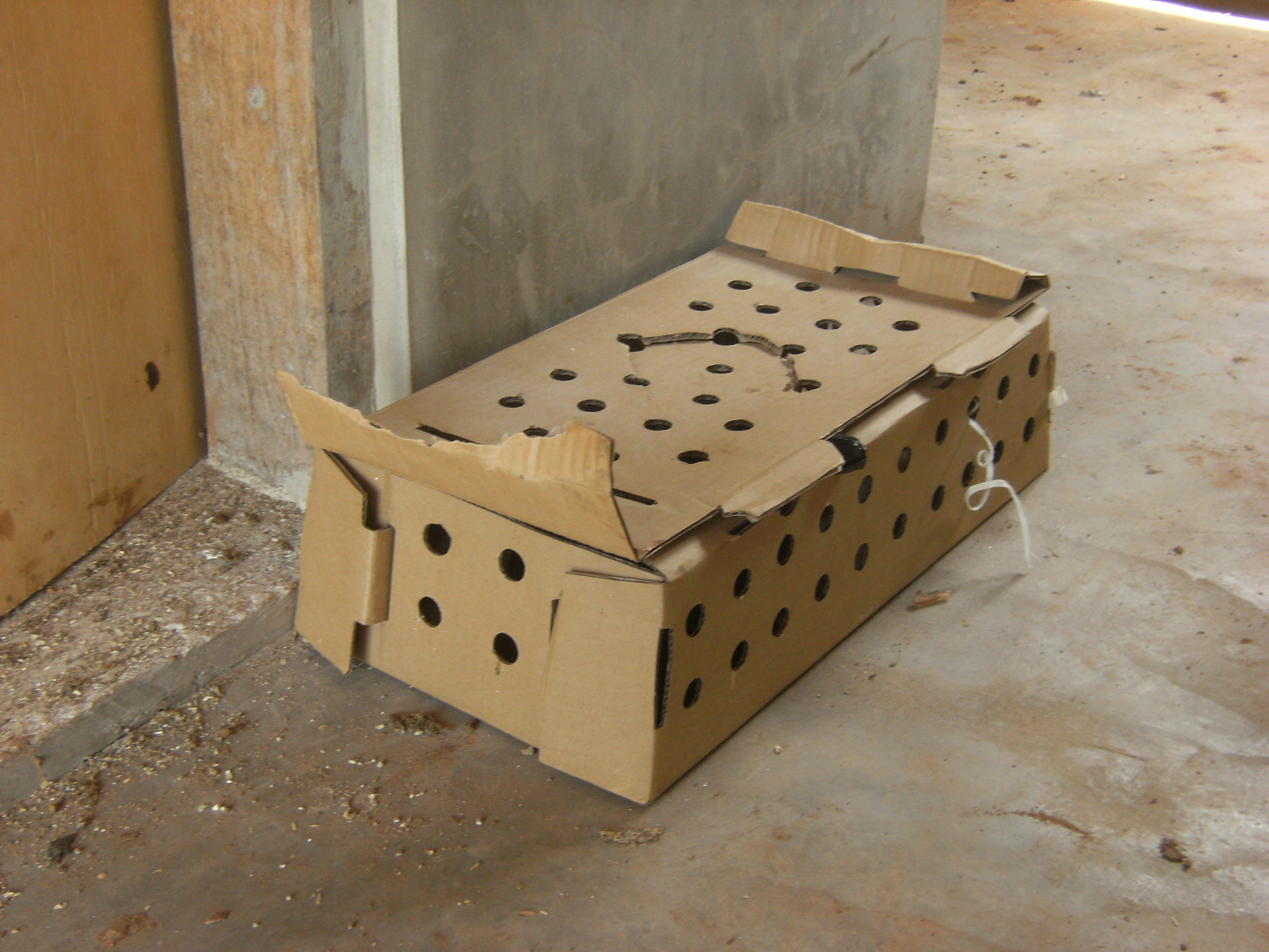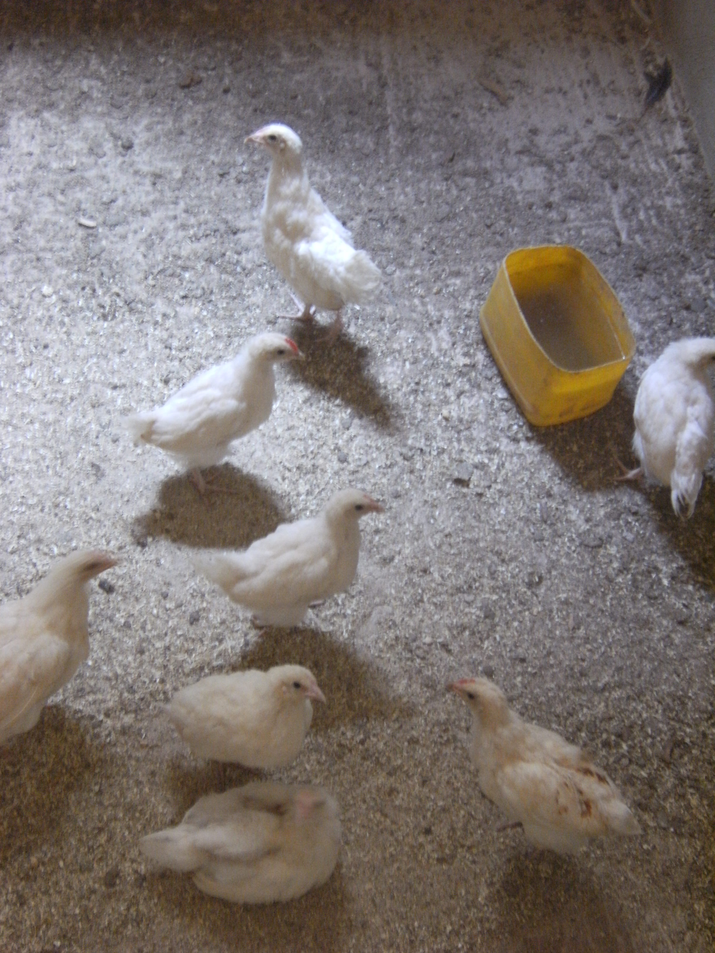 Bei einem meienr letzten Rundgaenge bin ich ausserdem ueber eine weitaus kleinere Pappbox mit Loechern gestolpert. Ihr Inhalt piepste und haeupfte schon in einer der Dusch-und Toilettenraeume herum. Ja, nun haben wir auch eine Huehner-und-Kueken-Grossfamilie. Auf dass sie sich fleissig vermehren, Eier legen und gutes Fleisch liefern.