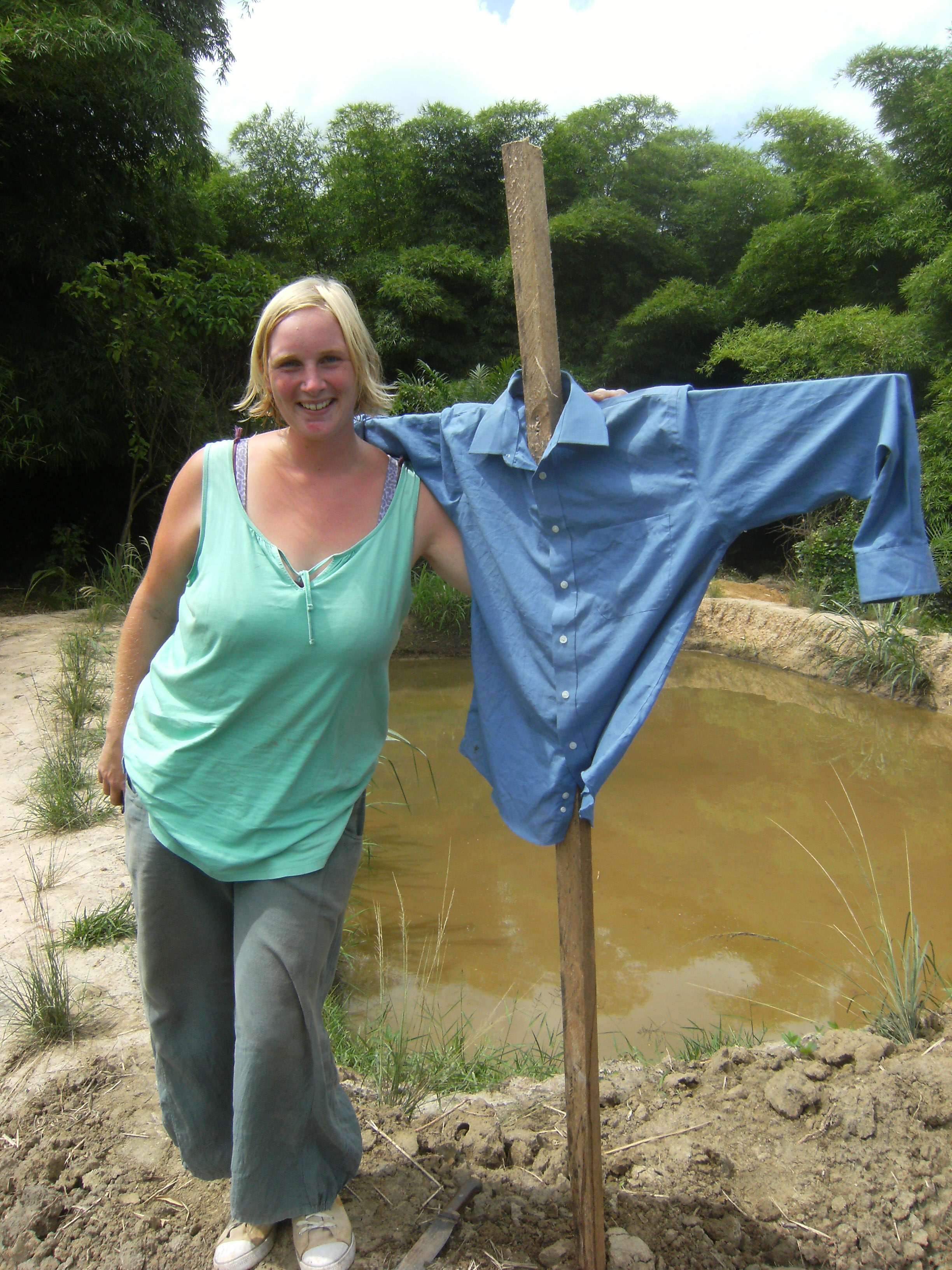 Die Fischteiche und ihre Bewohner sind in Bestform, schwimmen duch daas truebe Nass, wachsen gut und geben zu jeder Fuetterungszeit eine kleine Show. Die momentan einzige Gefahr fuer sie kommt nicht aus dem Wasser sondern aus der Luft. Unsere Mitarbeiter vor Ort in Old Adwampong haben Raubvoegel ueber den Fischteichen gesichtet. Hm…in einem Becken mit mehr als 500 Fischen laesst sich schneller und leichter Beute machen als stundenlang hinter Maeusen etc. herzujagen. Auch, wenn wir durchaus zu einer wahren Tierfarm werden, ist bei ungebetenen Dieben Schluss. Die Loesung: Vogelscheuchen. Schnell haben wir also aus einer kurzen und einer langen Holzlatte uns einem alten Hemd eine Vogelscheuche gebaut und aufgestellt. Das ganze mal drei und fertig ist der Raubvogelschreck.